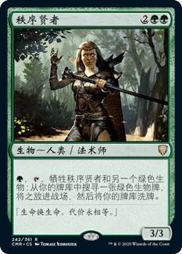 本来该出现在【C19】的绿色法术贤者却没有出现在【C19】,正当大家以为威世智鸽了的时候,【CMR】印出了【秩序贤者】。可是他的原型【自然秩序】甚至不是薪传禁卡,这不禁让人感觉他不配合另外四个法术贤者相提并论。(为什么不是【魔力通道】贤者??)一部分以妖精球为主题的指挥官套牌里会加入【和谐会所】,在你有【和谐会所】的时候,【秩序贤者】勉强能当一个高了一费的【自然秩序】用。如果实在需要【自然秩序】效应的套牌,有一点可能用一个【秩序贤者】。