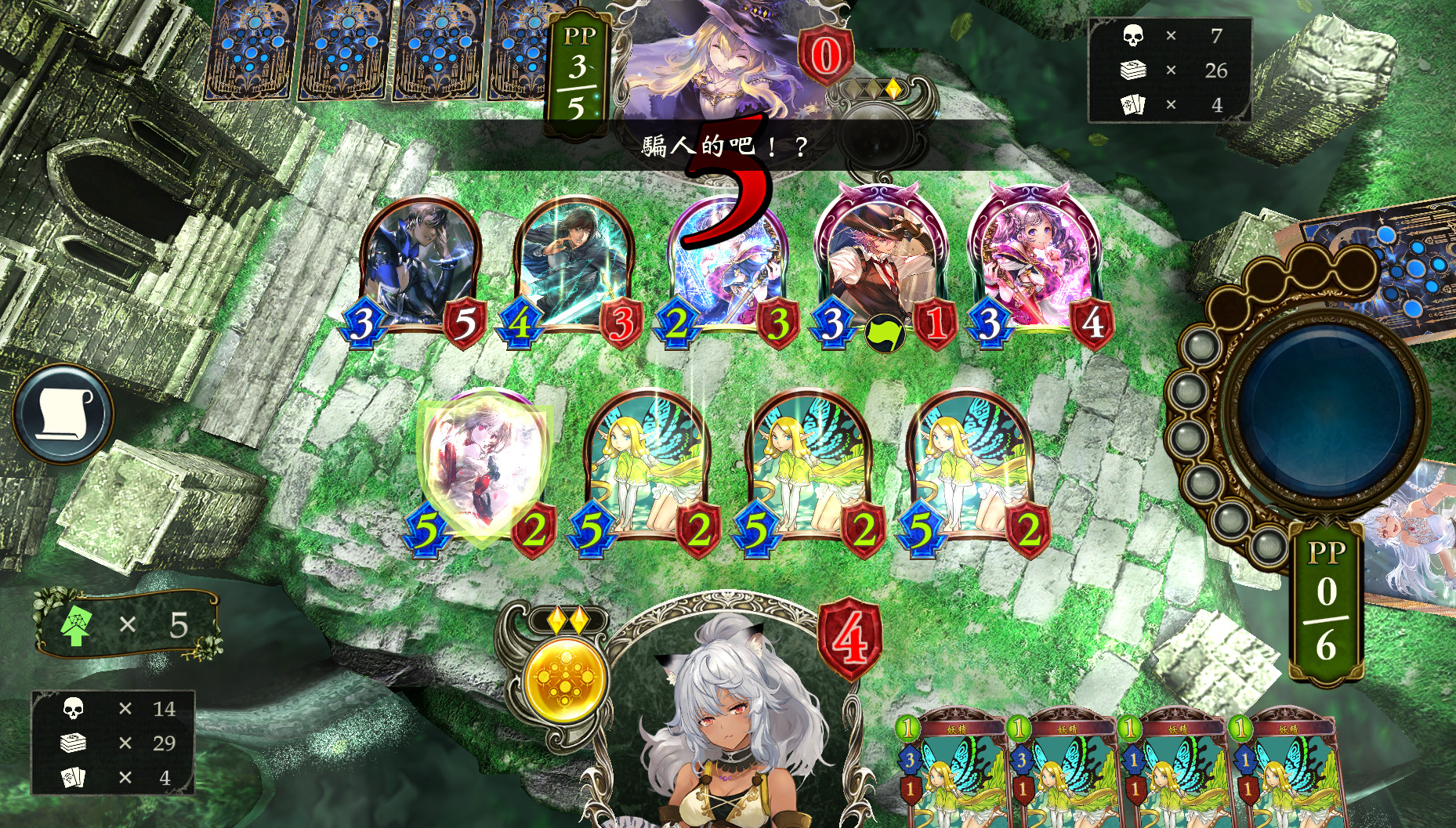 前期优先使用炎精之森、结晶调皮的精灵等制造妖精的护符。规划手牌数,尽量避免爆牌。如果一定会爆牌,根据手牌情况选择爆掉妖精(手中已有足够集体Buff组件),或牌堆中的未知牌(手牌不佳)。