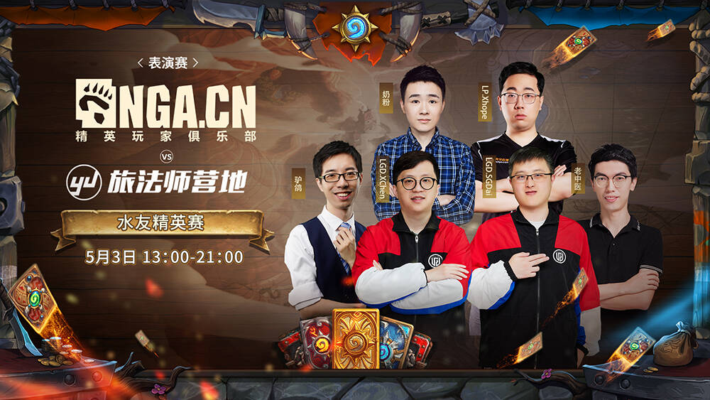 在比赛之外,我们还将在NGA与旅法师营地社区开展福利活动!在水友预选赛期间,双方日报组都将在赛前发布标准和狂野模式的参赛攻略各一篇,为选手提供参赛的卡组推荐;每日赛中,还会举办发贴秀战绩抽奖活动,轻松赢取战网点!在水友精英赛(5月3日)当天,双方日报组将选出各自的阵容,通过职业10选3的形式亲自下场操刀各类“整活卡组”进行一场bo5的终极较量!
