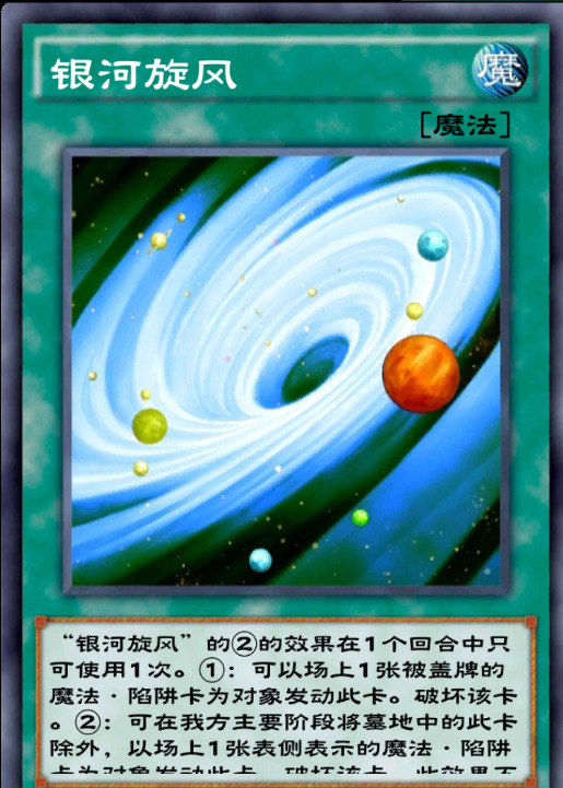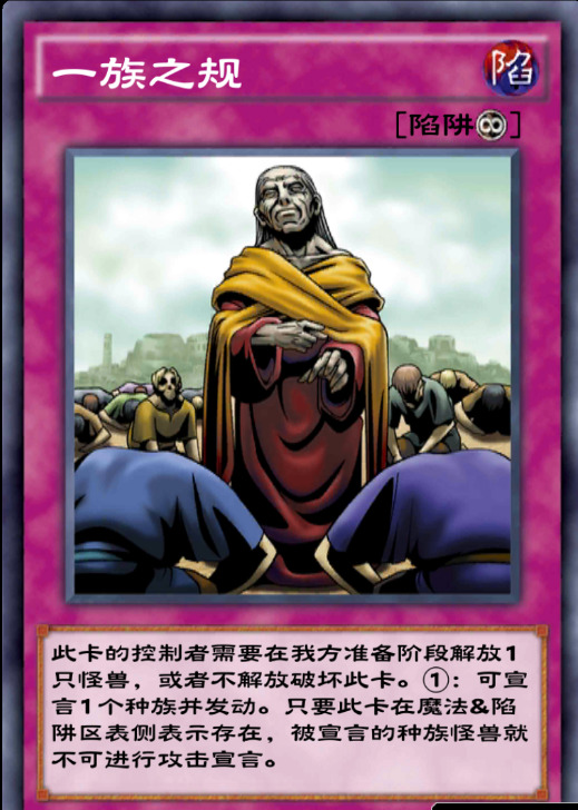 发动时宣言1种类的种族。那个种族的怪兽不能攻击宣言。每次自己的准备阶段若不把1只怪兽作为祭品则这张卡破坏。苟场神卡,注意提防银河旋风就好。