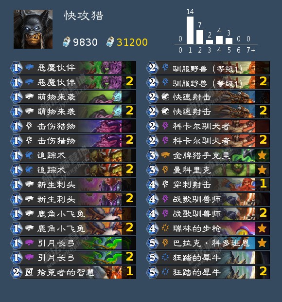 对战前期利用科卡尔驯犬者铺开场面,找准时机,放出狂踏的犀牛碾碎你的对手。