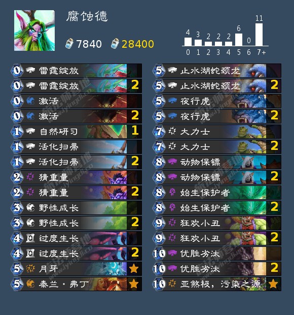 慢热开局,再用强大的法术牌逐渐占据优势。利用艾格文的无尽亡语,打出爆发式的终结伤害。