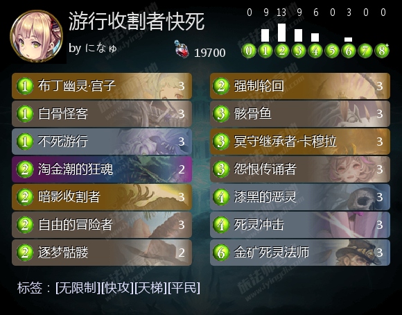 造物仇、教会教、疾驰法是无限制最强的几套牌,但如果只比上分效率,快死也不遑多让。尽管她无法取得很高胜率,但却能凭借超快的速度和简单的操作用于长时间冲分。