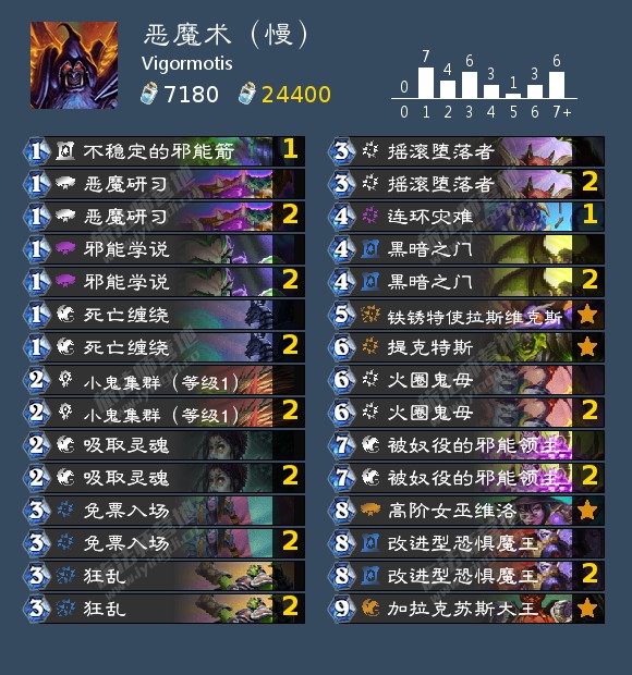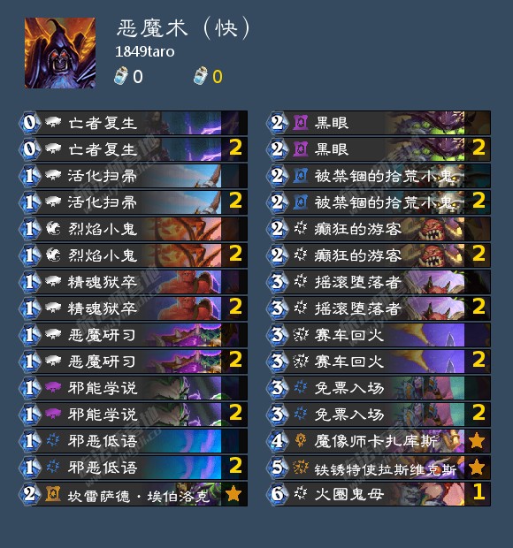 给大家带来一快一慢两套恶魔术。第一套卡组来自亚服玩家1849taro,他全程使用这套卡组从5级0星以56%~58%的体感胜率(因为是手机上玩的,没有具体记录)打上传说;第二套卡组来自于美服玩家Vigormotis,他使用这套卡组以64%的战绩从钻三打上传说。