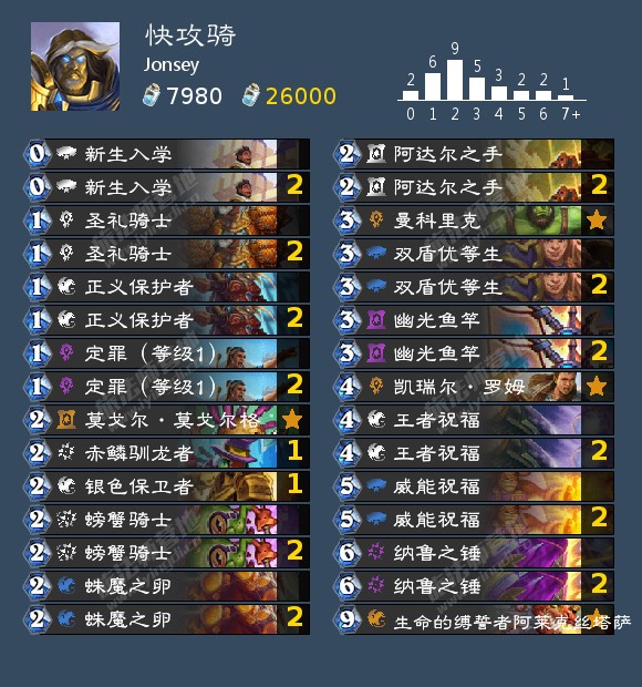这是Jonsey打到传说32名的快攻骑。这套卡组放弃了目前流行的奥秘体系和圣契体系,更多依赖超模随从和各类buff,本质上更偏中速骑(然而经常能够在前期就有极强的攻击能力)。这套卡组前期有各类圣盾随从和蛛魔之卵,站场能力很强,中期开始就通过各类buff来打出对手难以想象的场面,如果是螃蟹骑士被buff了,那很可能对手活不过我们的5费回合。一旦失去场面,中后期螃蟹骑士配合威能祝福也能返场,纳鲁之锤也是既能返场也能进攻的超模卡牌。如果仍然不能占据场面,则考虑全力走脸,以生命的缚誓者阿莱克丝塔萨来一锤定音。