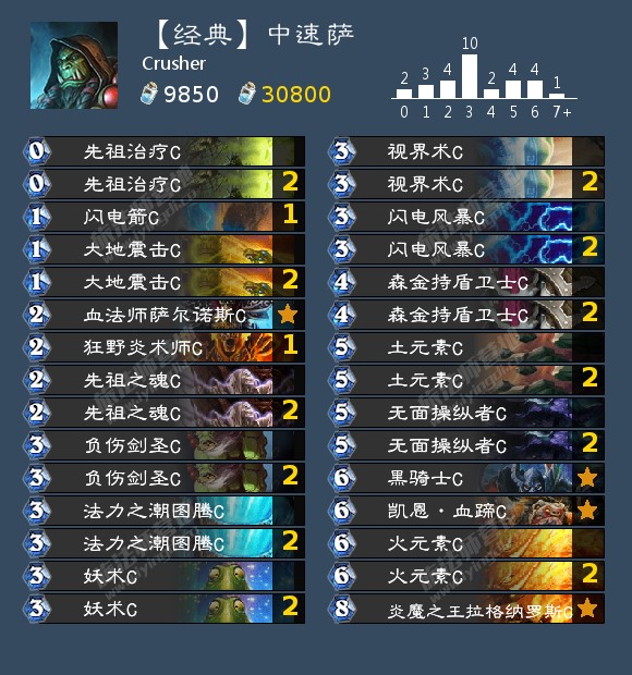 Hearthpwn网友Crusher的一套经典模式的中速萨,他使用这套卡组打上传说;我看到以后觉得很有意思,也用这套卡组上了传说。