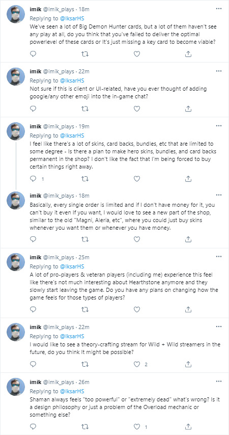 首席设计师Iksar本周的推特问答继续在周六进行。本周发言里对国服来说最有看点的肯定是Iksar对火妖法、黑眼术等狂野环境和平衡性的表态,这次他说得更具体了一些,虽然答案恐怕依然……另外他还就战棋竞技场等其他模式和功能的后续发展作了展望和设想,其中最有干货的就是战棋的下次大更新又将是非种族的更新,以及对于竞技场的优化方向他也有了更明确的表述。