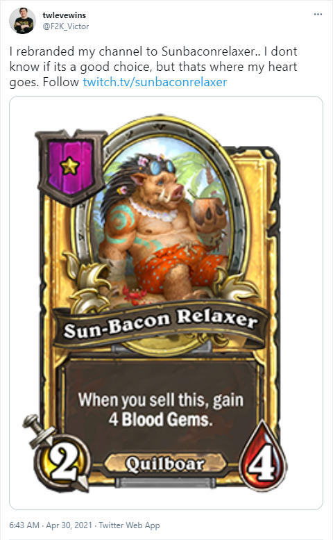 【Victor即twlevewins,Twitch知名高分段战棋主播,他在20.2补丁日志公布后喜欢这个形象喜欢到把直播间整个从自己的昵称改成了这张牌的牌名。这个程度的品牌重塑在外服直播圈还要显得疯狂得多得多】
