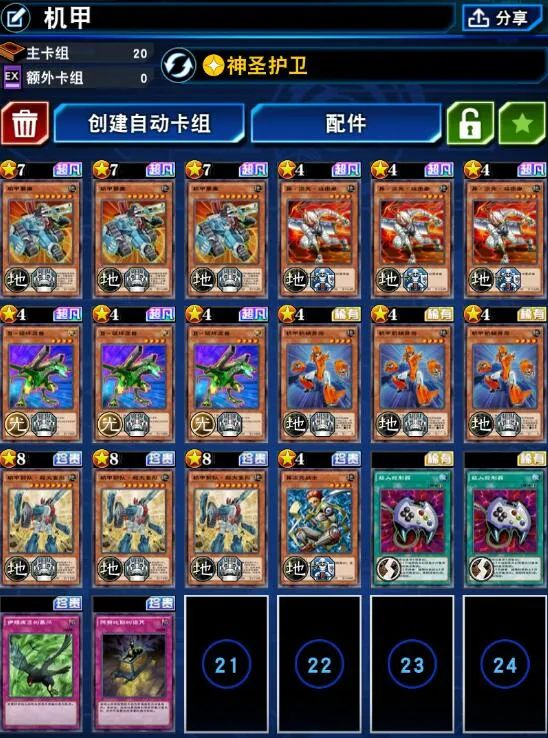 此外,由于【神圣护卫】这个技能的存在,在面对守墓时无需care审神的群体减攻,可以肆无忌惮的打穿守墓的遗言链。在守墓不得不出审神之时,可以在下回合使用500攻的机甲要塞对其场面狂轰乱炸。基于此,主卡无需携带守墓的针对牌:抹杀、银河旋风、破邪大剑等。释放更多卡位,提高卡组的稳定性。