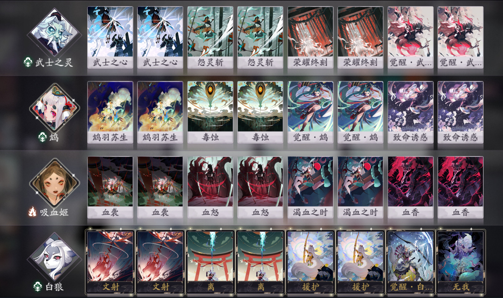 起手留牌:武士之心,觉醒武士,鸩羽苏生,觉醒鸩,血怒,血袭,文射,离。