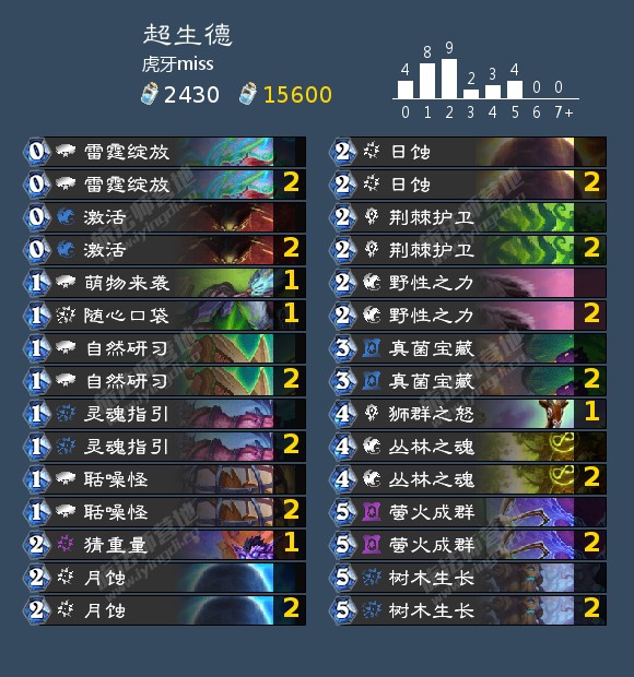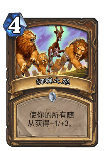 15.狮群之怒:这张卡起初我是满编的,看上去非常强,以为德鲁伊是版本答案,实测,两张卡手,你场上两三个怪,这张卡等同于五,怪多贴收益才会大,和丛林之魂不同,但是对阵术士是个例外,举个例子,五费萤火成群,双花呗你是贴丛林之魂还是狮群之怒,对面下回合6费,这里必然是狮群之怒,可以把场面战死,对面术士配合新橙卡可以校园惊魂,接校园惊魂,或者双校园惊魂,小技巧:术士1-2费没AOE,3-5费打2,或者狂乱,6费全场打4,7费有可能玛丽西亚,8费扭曲虚空,这里就很关键了,比如术士下回合8费我们必然选择丛林之魂,下回合6费,我们必然选择狮群之怒,很多人说不好打术士,其实很好打,只要6费前,你铺一波33,他解不掉的,主流术士哈,别说个别的,那是例外。先手后手都不留。