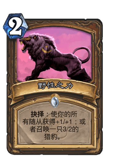 12.野性之力:中规中矩的加11,不知道你们发现没,这张要场面很多怪才还用,配合聒噪怪,2-3个22不强,至少4-5个,才有效果,很多时候都是花呗过载,刚好打个2费,满编是必然的,但是配合起来如果有狮群,丛林等,这张卡优先级要低一点,对阵术士可以考虑3-5费铺33,对面是解不掉的,自撕牌那种打5,可以解,正常术士要6费做到打4,同样有配合留,其他情况都不留。