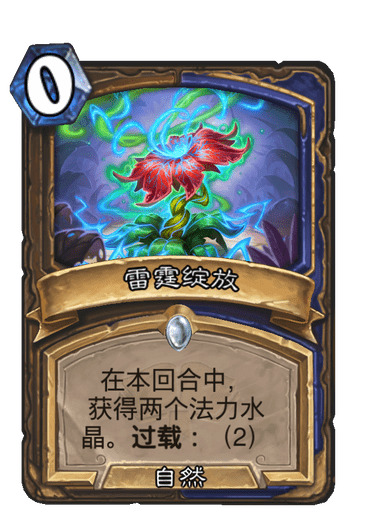 2.雷霆绽放:神卡,学名花呗,用了就要还,但是提前用了真的爽,例:后手硬币真菌宝藏,花呗萤火虫群,下回合打个野性之力+11,节奏拉满,一个聒噪怪,两个花呗,树木生长,2费劝退,后手一费就可以启动,这是天胡形态,很多时候五费萤火成群,双花呗亡语,狮群,单花呗加11,都很强,后手考虑留,先手有配合才会留。