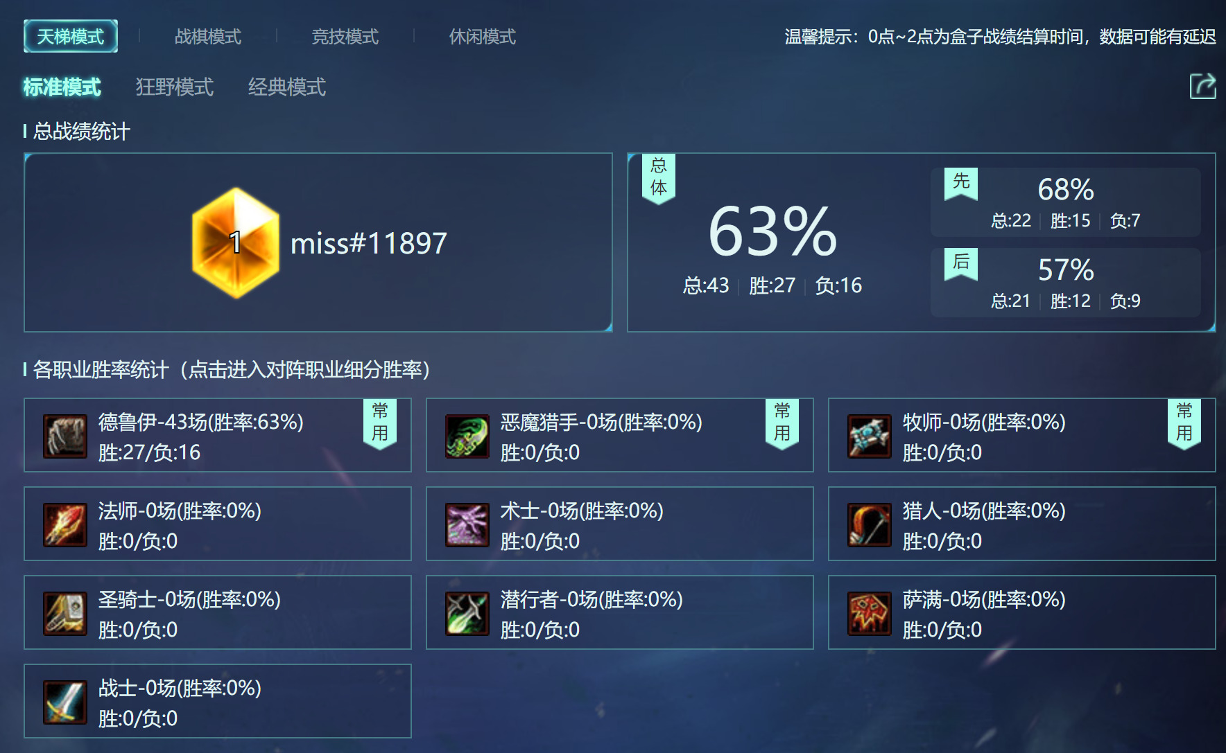 青铜10开打 美服3点更新 历时4小时12分,截图稍晚,总场次43场,对阵各职业胜率图也发了,我的理解是超生德可以打任何职业,比赛可以带,不能帮你穿三,也不会背锅,是一套廉价且有强度的卡组,尘不多可以考虑用来上传说,效率好用,本篇攻略会好好讲述对阵各职业的思路、留牌,先上卡组: