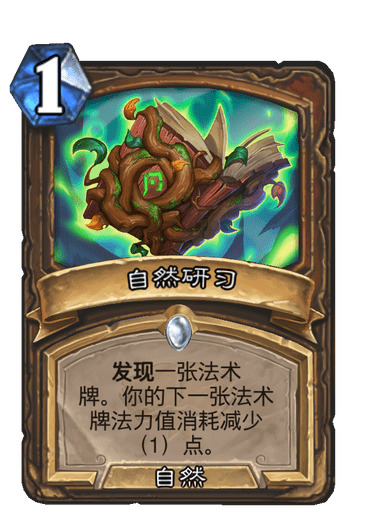 5.自然研习:很强力的卡,最好的是一费自然研习配合真菌宝藏,这样12费连贯过牌,手牌充足才可以去运营,满编,先手后手必留,找到过牌的概率很高,没找到,也是减费,很好用。