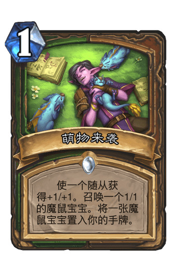 6.萌物来袭:这张卡很尴尬,如果有聒噪怪配合,越多越好,可以配合多出一个频率,且场上怪,加11,以前满编,但是经常遇到场上没怪,打不出,后来经过实践,一张最好,例:后手硬币萤火虫,对面如果给你留4-5个,可以萌物来袭加丛林之魂,把场面站稳,有场面才有输出,运营,除非有聒噪怪配合刚好需要它,不然先手后手都不要留。