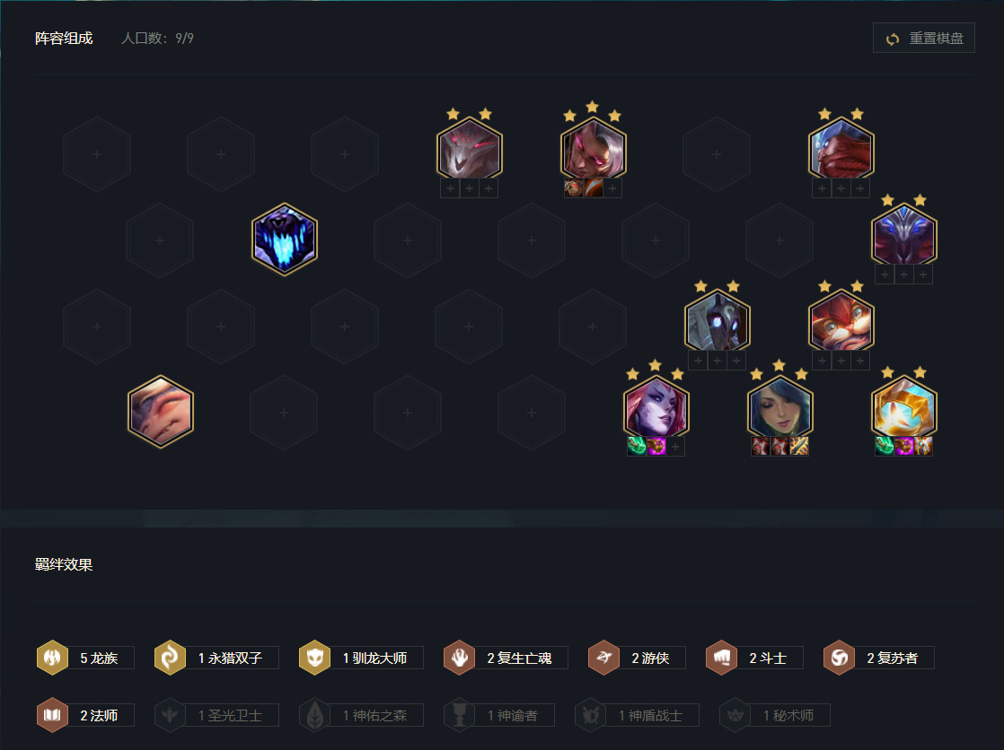 阵容原理:利用龙族带来的大量经济在棋子星级和人口数上碾压对手,速8人口抽到大头孵金蛋,后期龙族棋子三星下掉乌迪尔带上大量5费卡极其强势。但是操作难度大,板凳区经常位置不够,犹豫容易白给,抽不到大头会崩,非常考验运营能力。