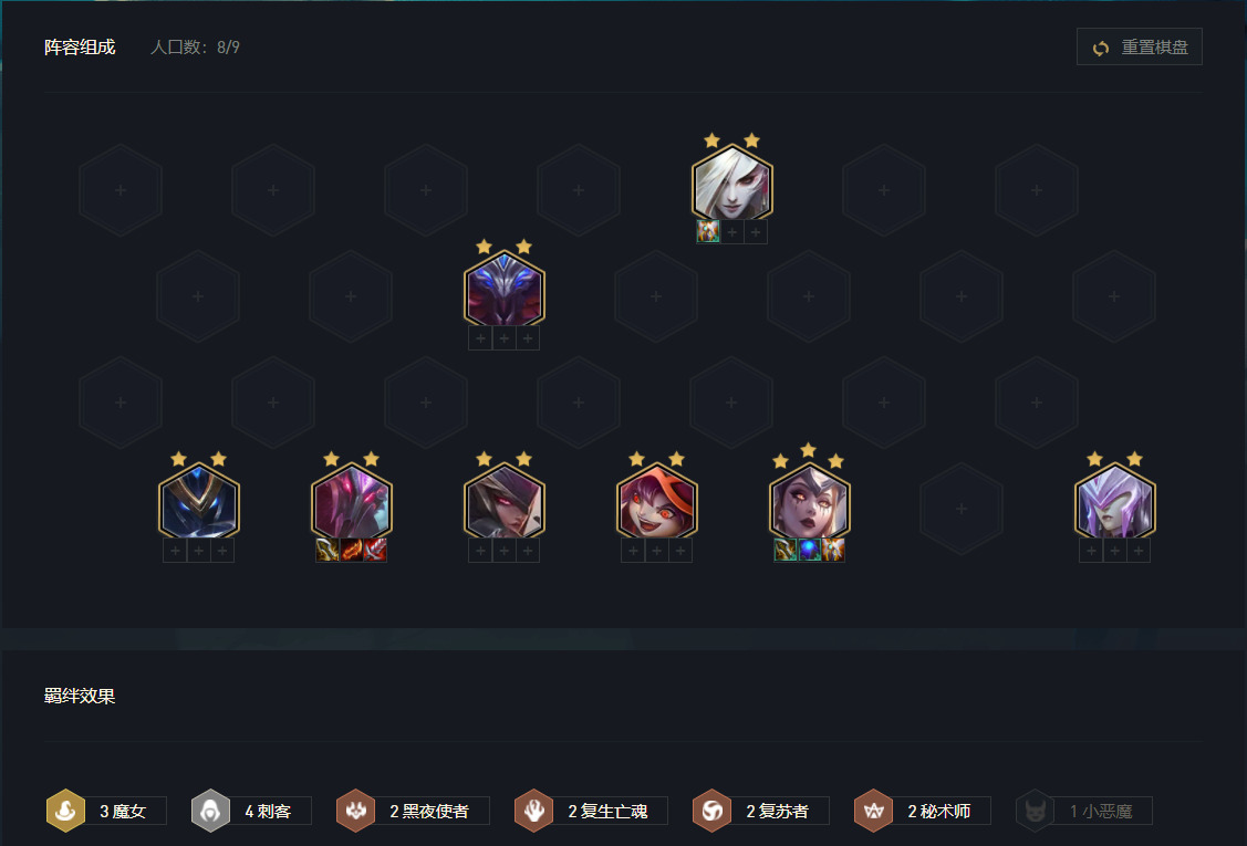 上9人口,适用于没有花钱追3星的妖姬,这时你的经济是比较充沛的,只用视情况追3星梦魇,然后按下图补充橙卡质量即可。注意刺客们对位对手主C哦。