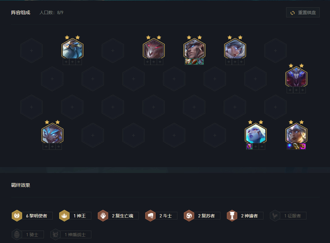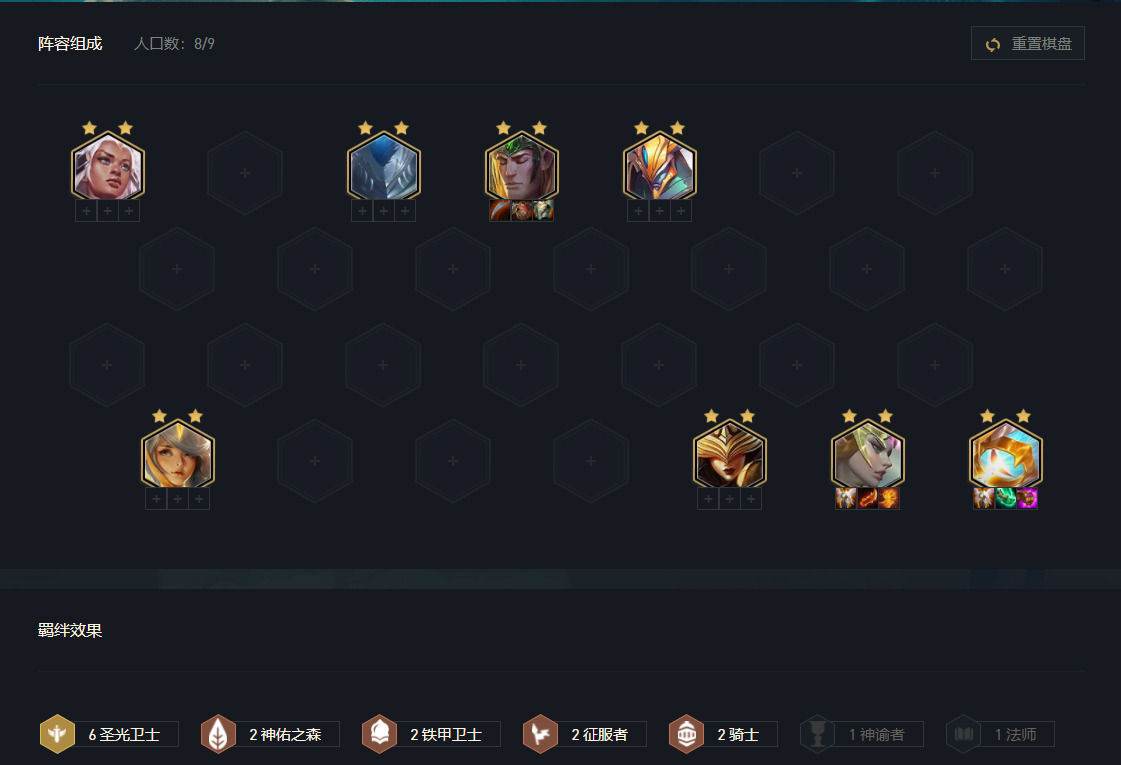 上5人口,继续以3圣光为核心补充质量,骑士,游侠,征服者都是2人羁绊,很容易开出来。