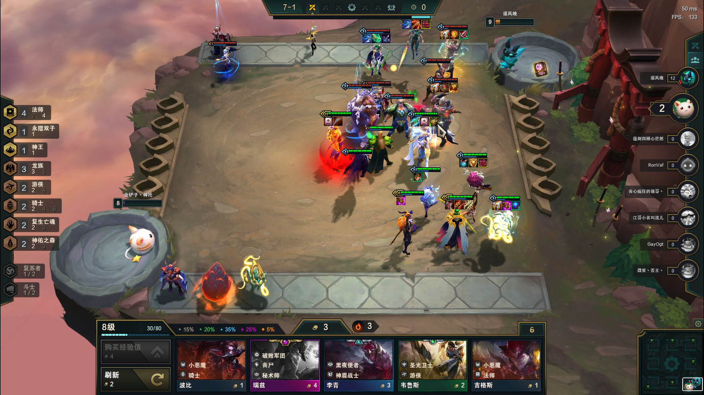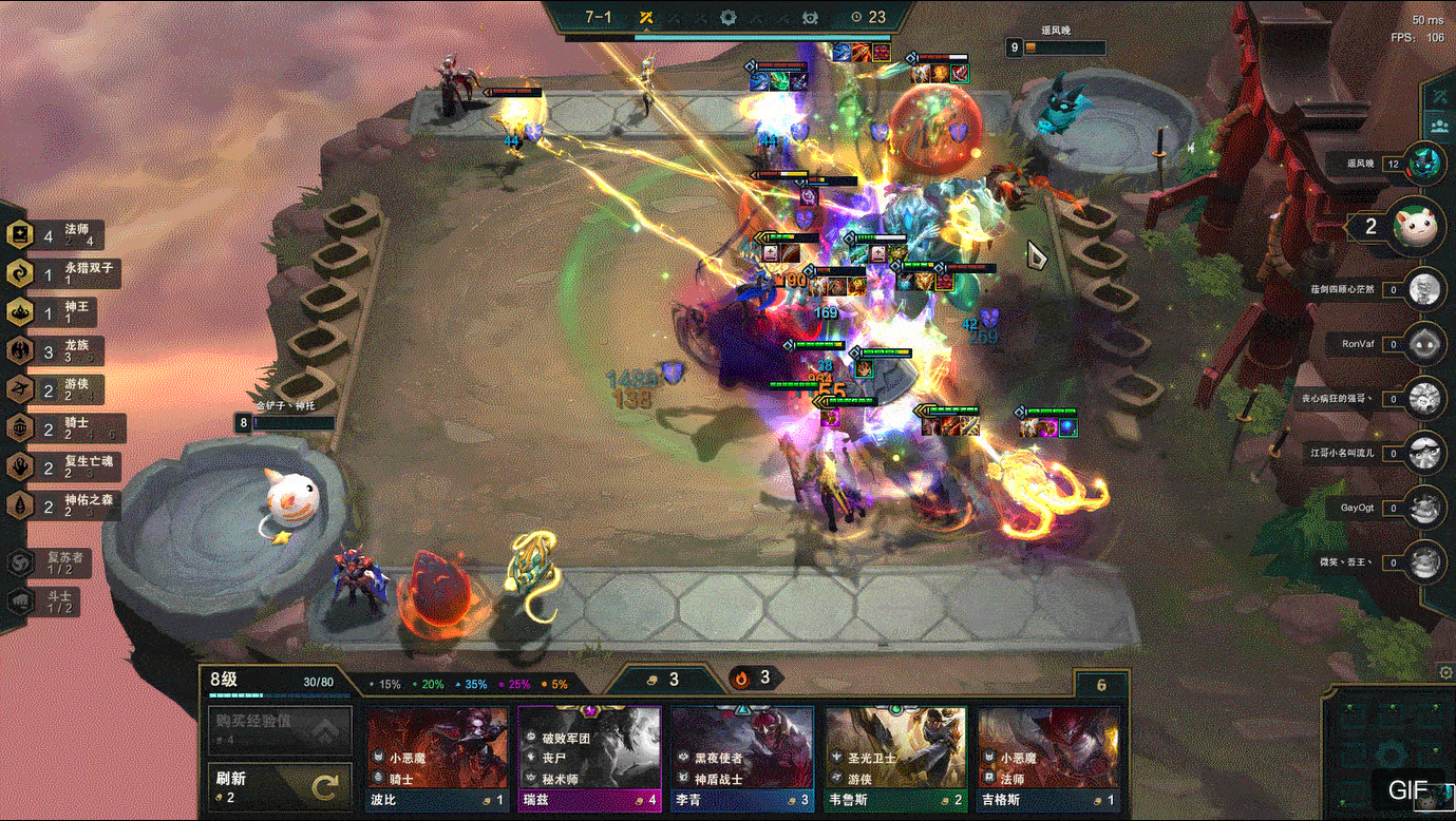 如果我们血量不佳,但是这回合上8后有40块钱左右的话我们果断上8快速抽大头。合理安排瑟提婕拉艾希哪张追3,最多同时追2个,不然卡板凳可就难受了。