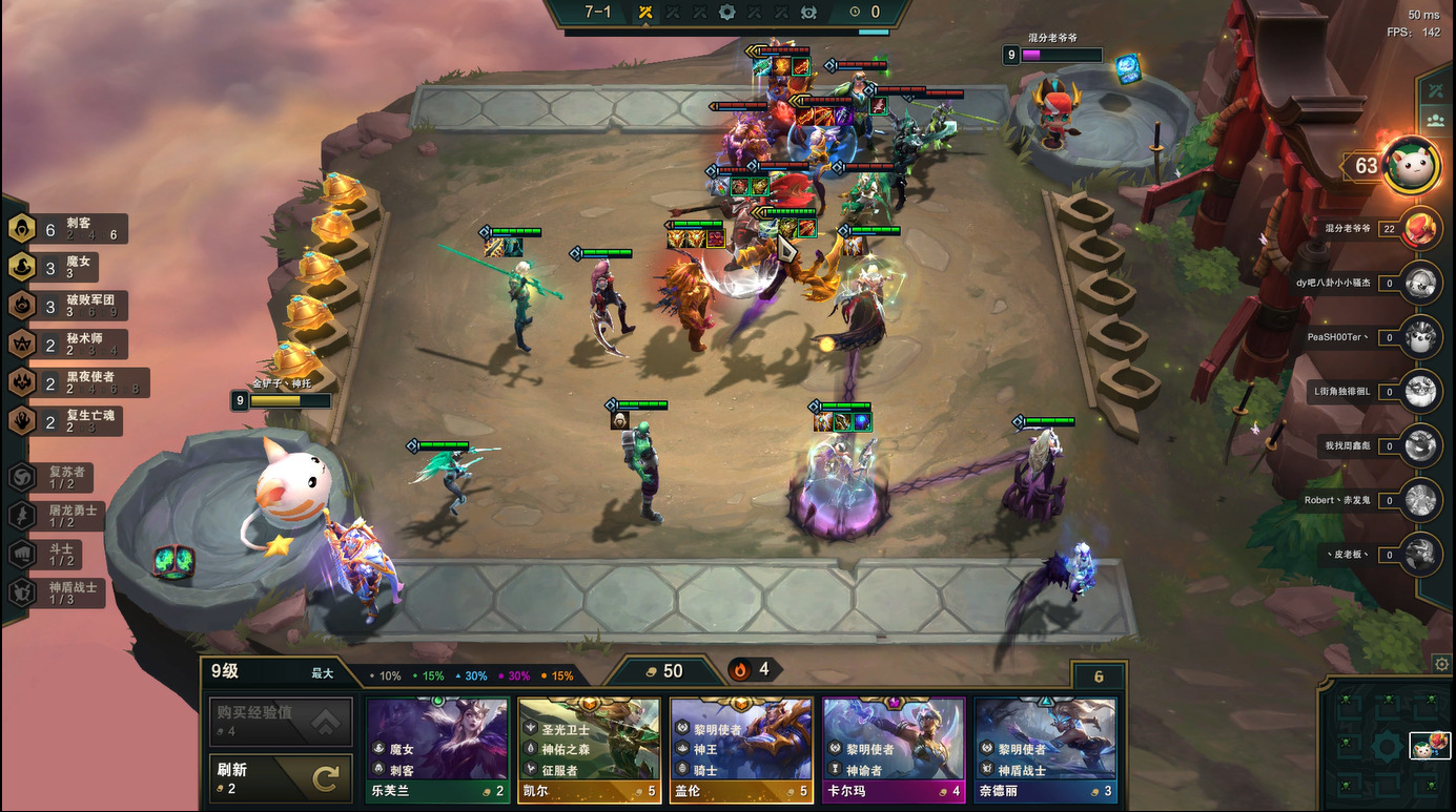 上7人口开3魔女4刺客,最好还能抽到一张艾翁补充前排。这时只要你有妖姬神装基本上是无敌的,划水渡过4阶段即可。妖姬如果来的很多(6张以上)可以停在这个人口给妖姬梦魇抽3三星。(但是这个版本同行会很多,妖姬很难3,不强求)