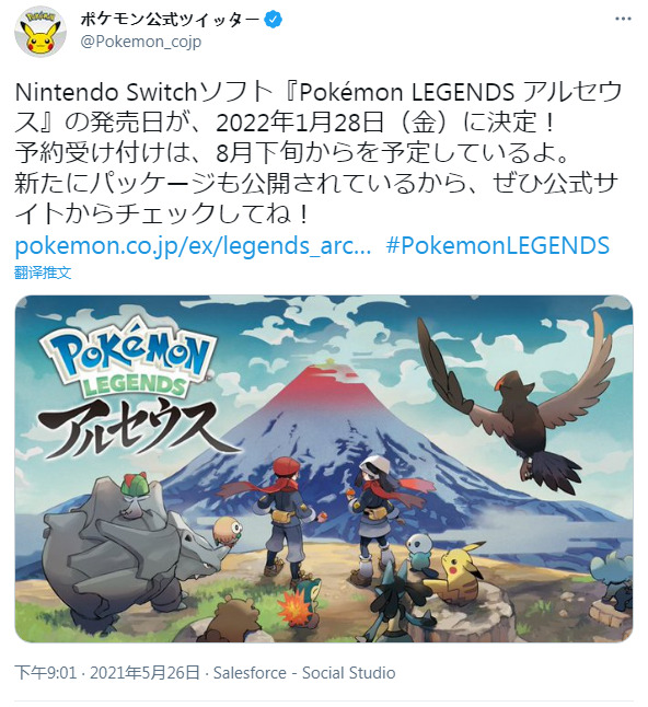 《宝可梦传说:阿尔宙斯(Pokémon Legends Arceus)》宣布将于2022年1月28日发售,价格为6578日元(约合人民币386元),预计将于8月下旬开启预约。