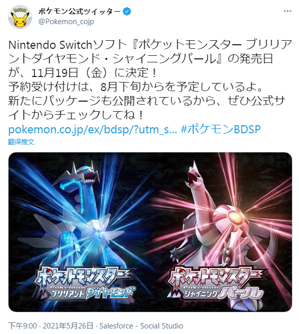 《宝可梦:晶灿钻石/明亮珍珠》则将于今年11月19日正式发售,同样将于今年8月下旬开放预约。