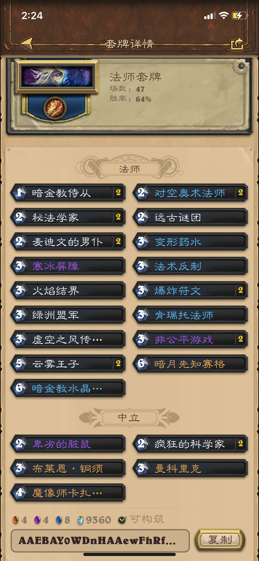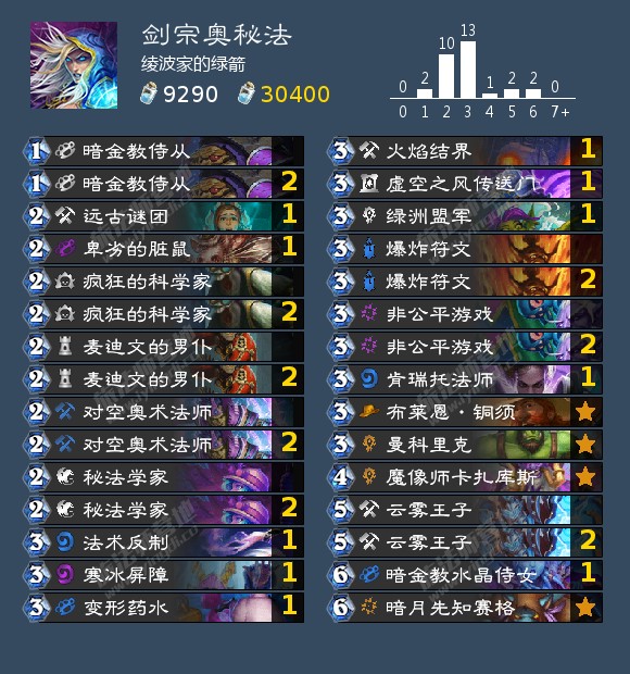 从以上这些数据看来,我觉得这一套奥秘法还是非常适合现在的环境的。接下来我将给大家介绍这套卡组的构筑、单卡介绍、推荐留牌、对局分析、以及和老师那一场对局的复盘。因为狂野一直处于每个月上完传说就挂机的状态,mmr高的小号现在排一把要2分钟也没时间打了,所以分段没有很高,希望大家见谅。