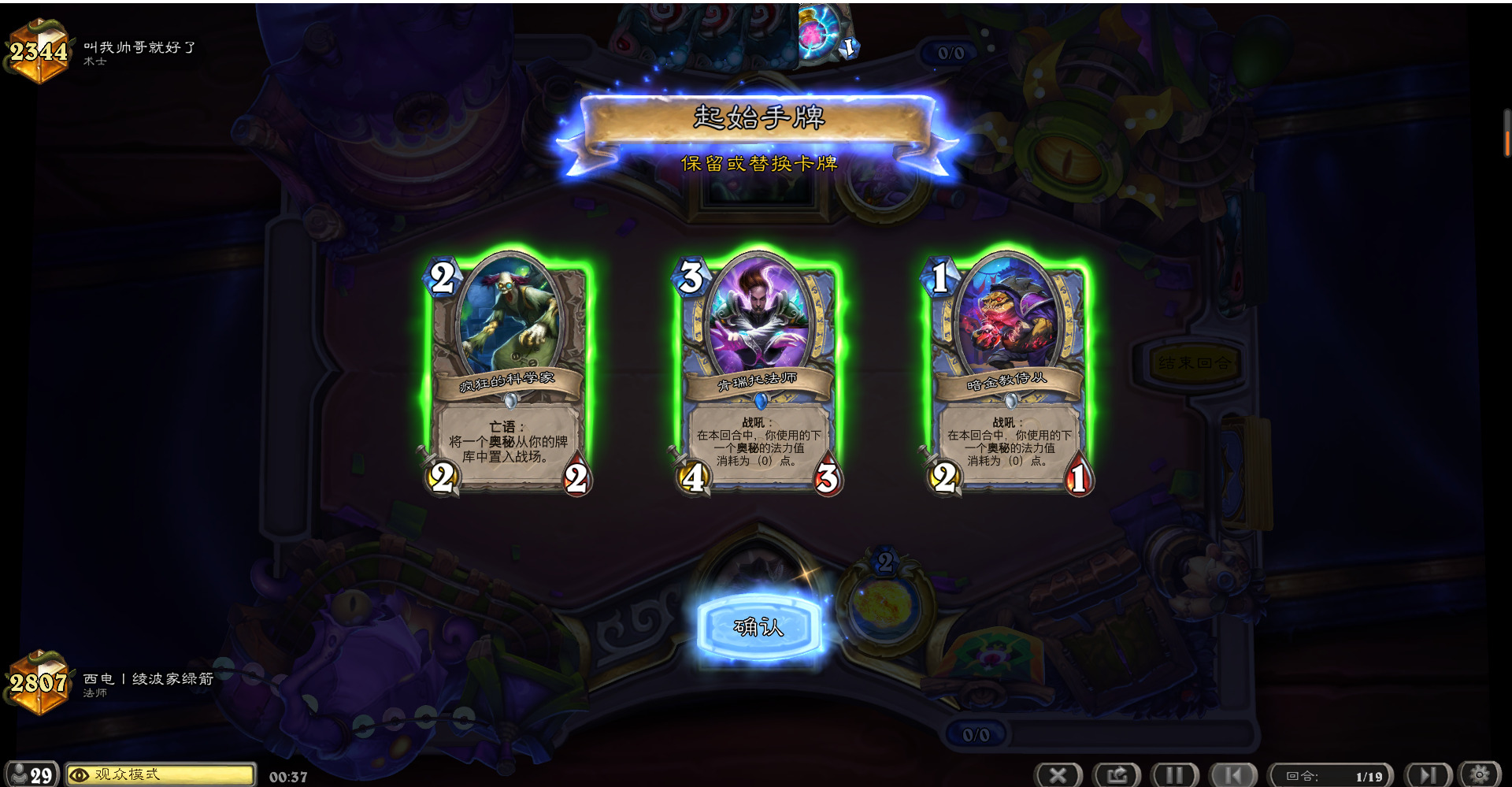 可以看出我们这把的起手还算不错,有1费随从、2费随从,但怕没有奥秘,我还是选择换掉了肯瑞托法师。