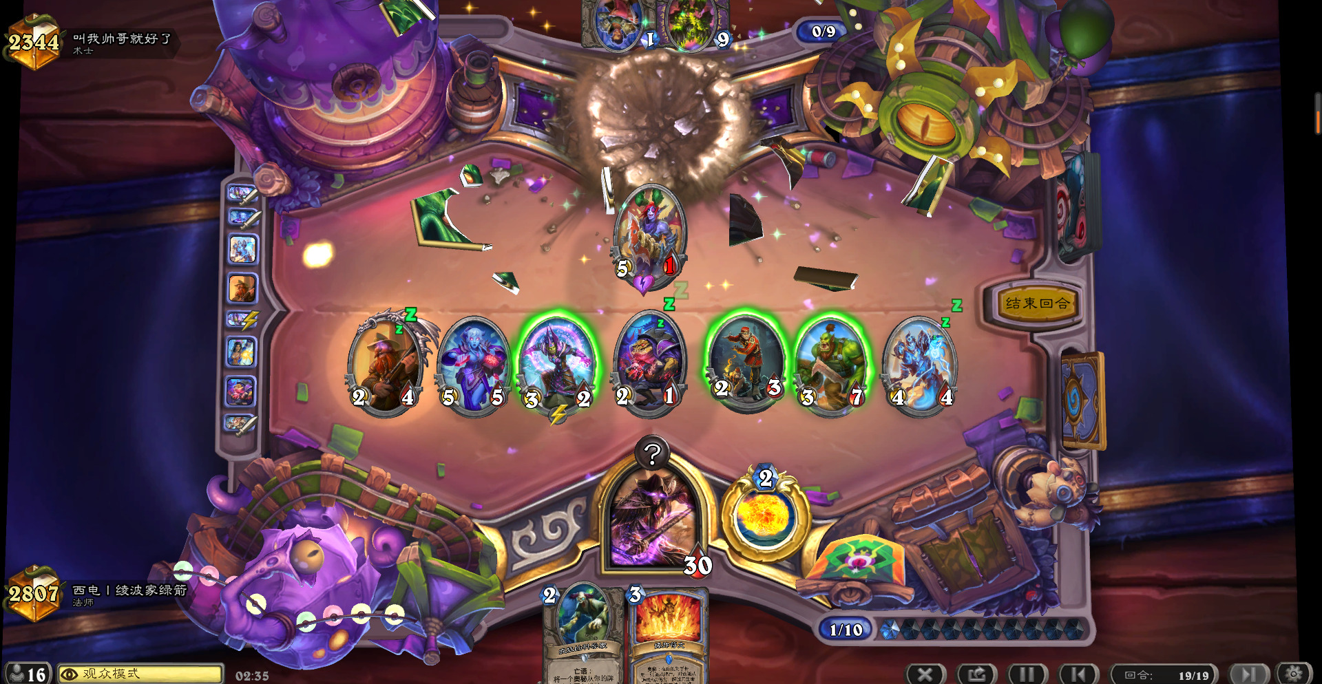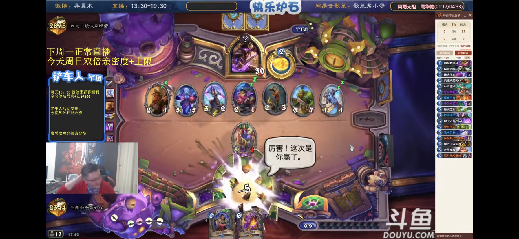 其实打老师的这一局还是很典型的打宇宙卡组的例子,让对面一直处于我们的节奏之下,我们通过非公平游戏超模的过牌打出卡差(可以看到老师最后手牌比我还少了),一波一波组织进攻,宇宙卡组在没过牌的情况下肯定会断解一波的,我们就抓住机会拿怪蹭脸,然后通过铜须的combo斩杀。