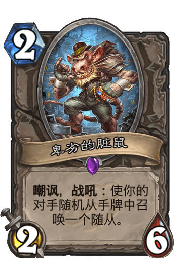 一开始只是带了针对火妖法,但玩起来发现脏鼠这张卡是真的非常好用。在对阵宇宙牧时,对方的卡牌经常会被我们消耗到只剩下4张左右,这时对面一直不出的牌就有可能是雷诺·杰克逊 或者裂心者伊露希亚 ,我们用脏鼠拉出来就很舒服。在打奇数瞎或者海军贼时也能帮我们抗下致命一刀,延长一个回合数。在打决斗法以及逐渐兴起的无限火球法也有着优秀的发挥,让他们测奥秘的随从越来越少。还能让对面不得不触发绿洲盟军。基于这些原因,我还是选择继续携带脏鼠。