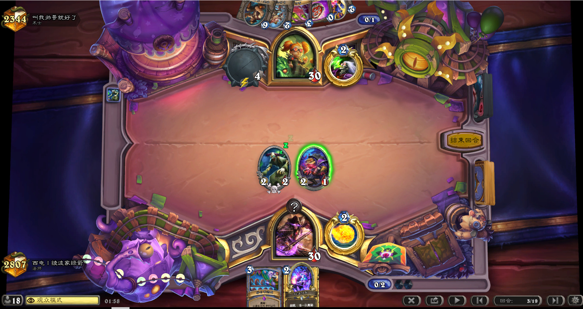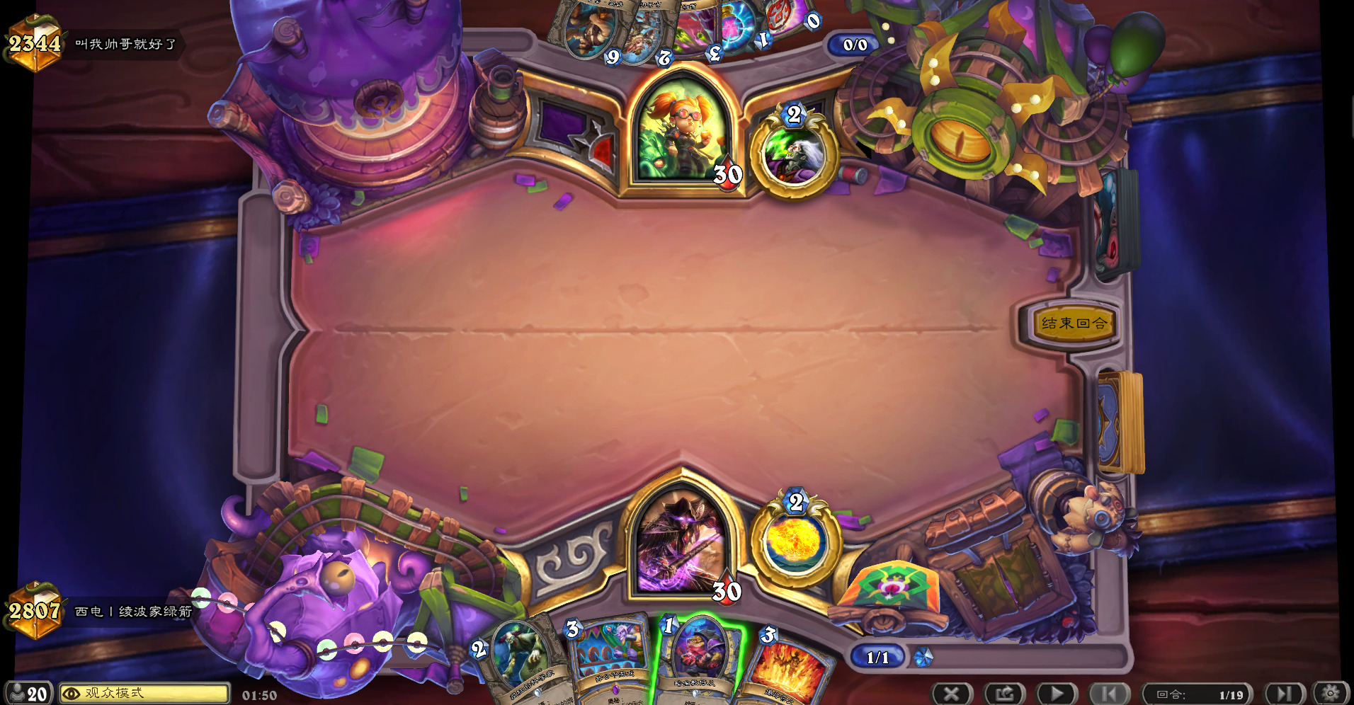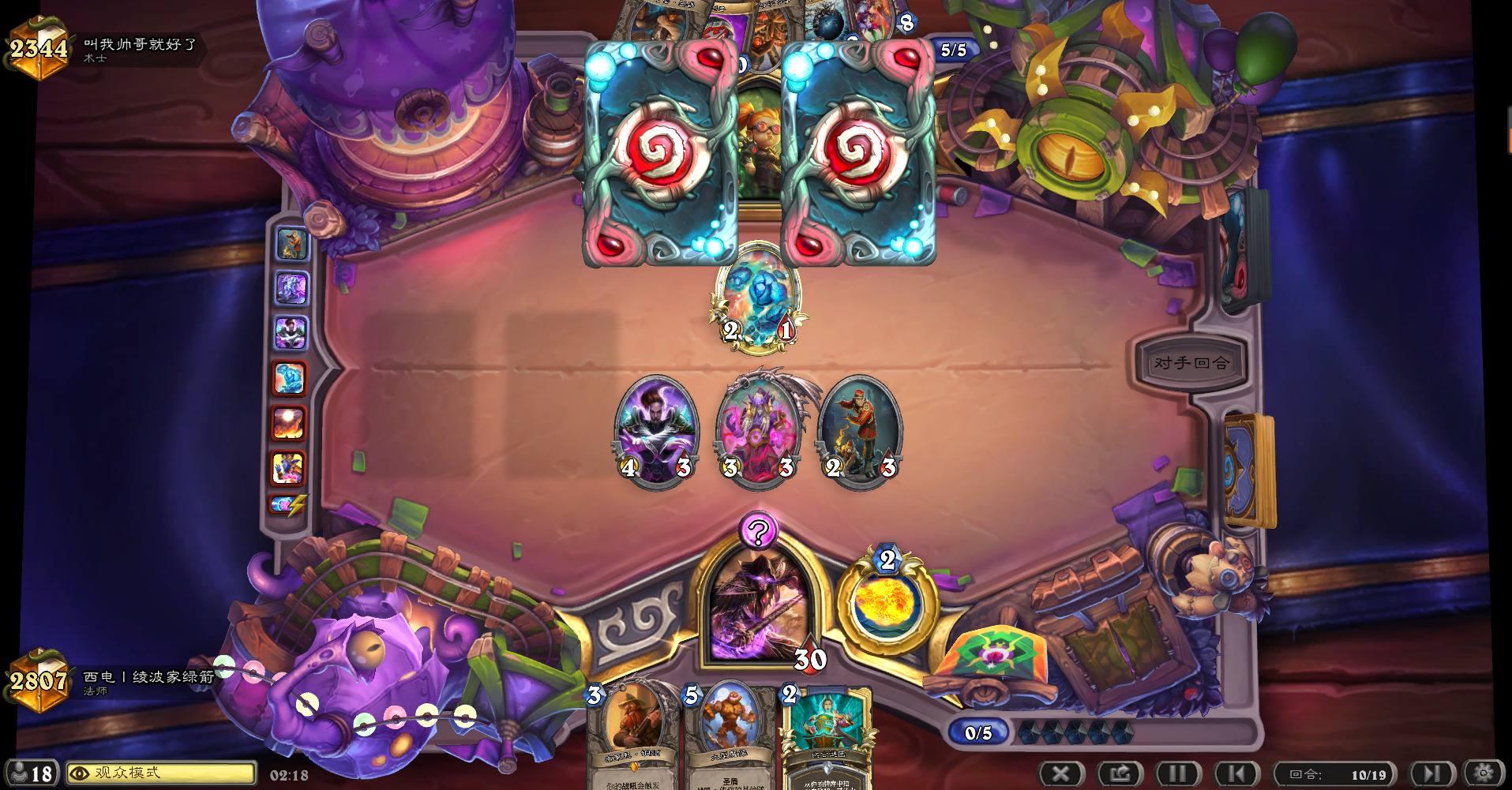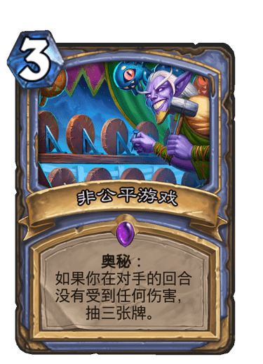 可以算天胡起手了,老师同样也很胡(下一抽抽到了姐夫),这里的抉择点就是挂爆炸符文还是非公平游戏,我还是选择了挂爆炸符文,因为宇宙术的1、2费随从有侏儒吸血鬼、卑劣的脏鼠、护甲商贩等,如果我们挂非公平游戏而且老师有这些怪的话我们几乎要被白嫖2个怪左右,这是我们不能接受的,而且我们2费也有怪不会亏节奏,3费挂非公平也能及时触发,所以还是下爆炸符文更优。