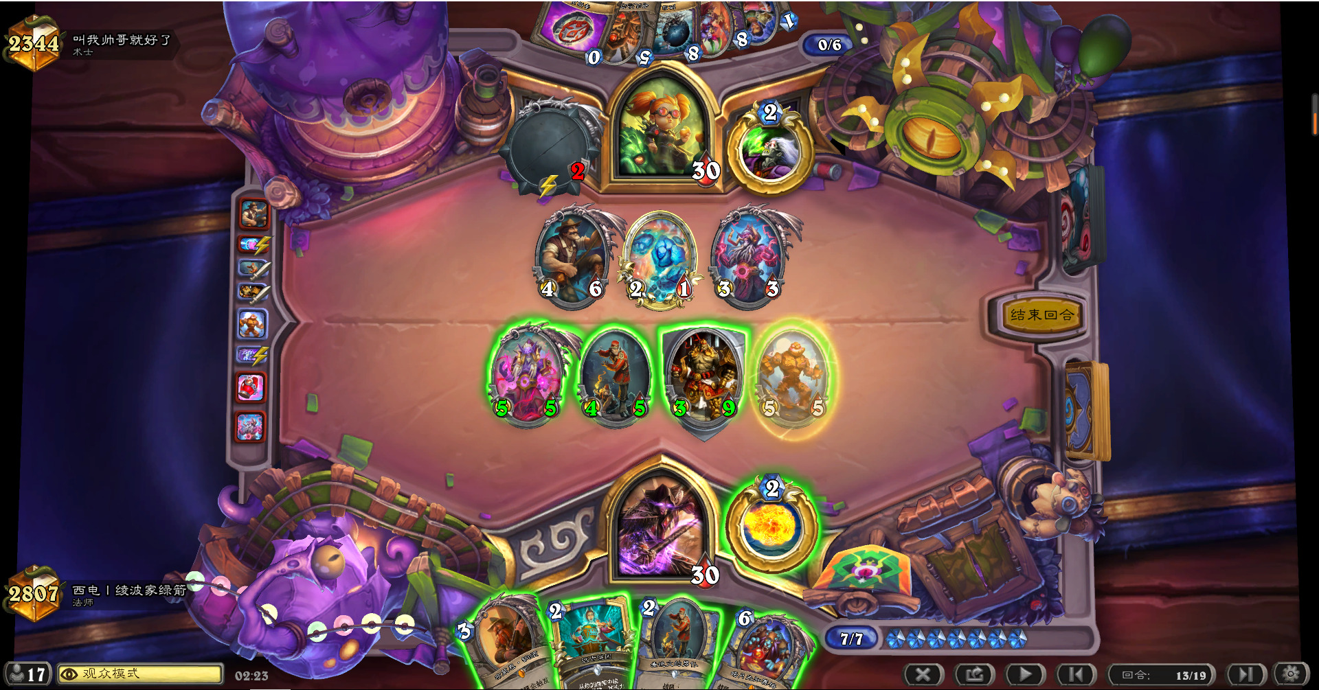 这里有2种打法,一种是抽奥秘+男仆+技能,一种是直接赛格,因为老师下回合想活的话只有解场,所以如果我们选择第一种打法的话是不能有效的发起下一次进攻的,直接赛格准备下回合的进攻。老师被逼无奈只能跳币交扭曲虚空,同时血量被我们压至13血。一切与我们预想的都一样,节奏继续向我们这里倾斜。