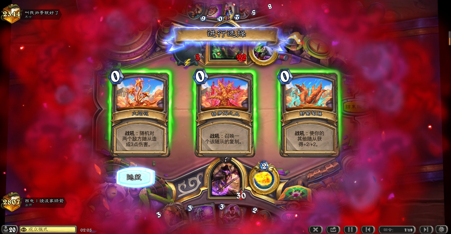 4费我们打出非公平抽上来的卡扎库斯,我第一个选择了圣盾,这里有复制和buff,因为头上的奥秘是元素盟军,所以还是选择了更稳的buff,因为复制的话还是怕狂乱和姐夫,我们手上有虚空之风传送门,下回合再通过肯瑞托法师+麦迪文的男仆应该可以稍微制造出一波场面。