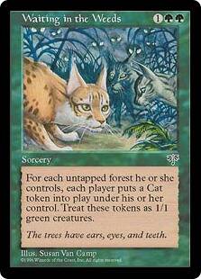这显然不是松鼠。 基于某些原因,不明的小东西是猫,而由于插画是如此,我们得要改变这张牌的功能。 松鼠的初登场变成了晴空号里一张名为 Liege of the Hollows 的牌,而我也在Unglued里制作了一张名为 Squirrel Farm 非常有趣的松鼠牌。