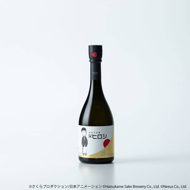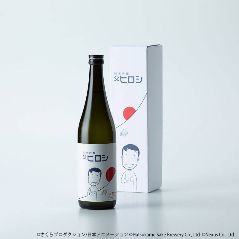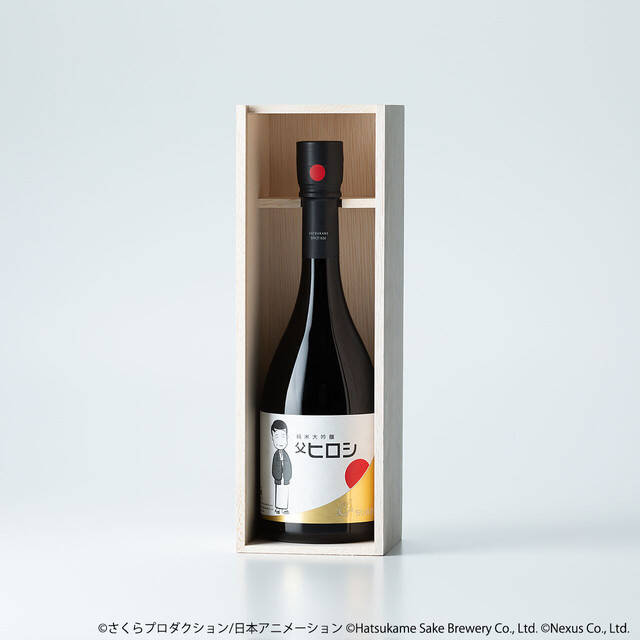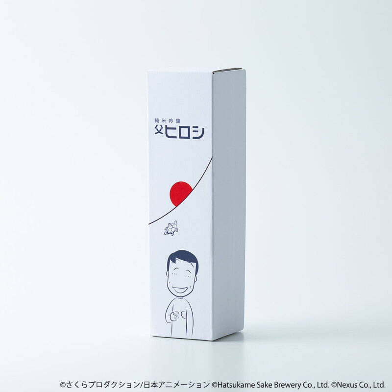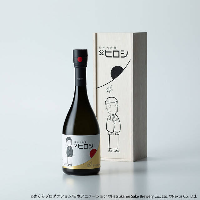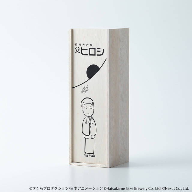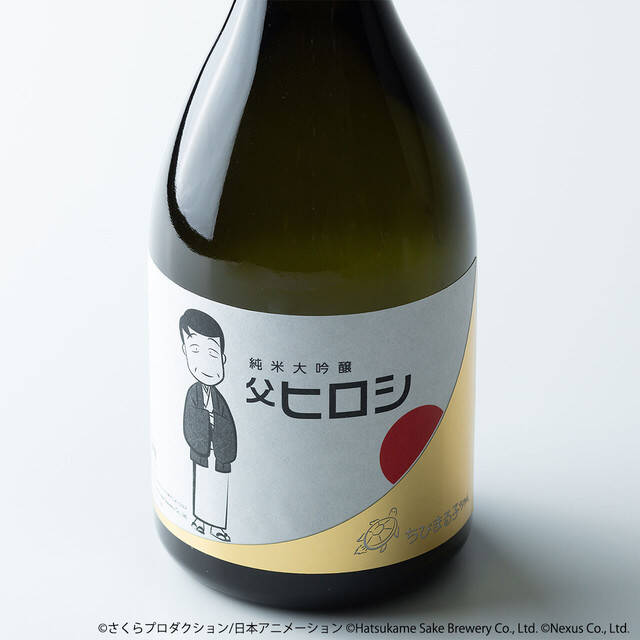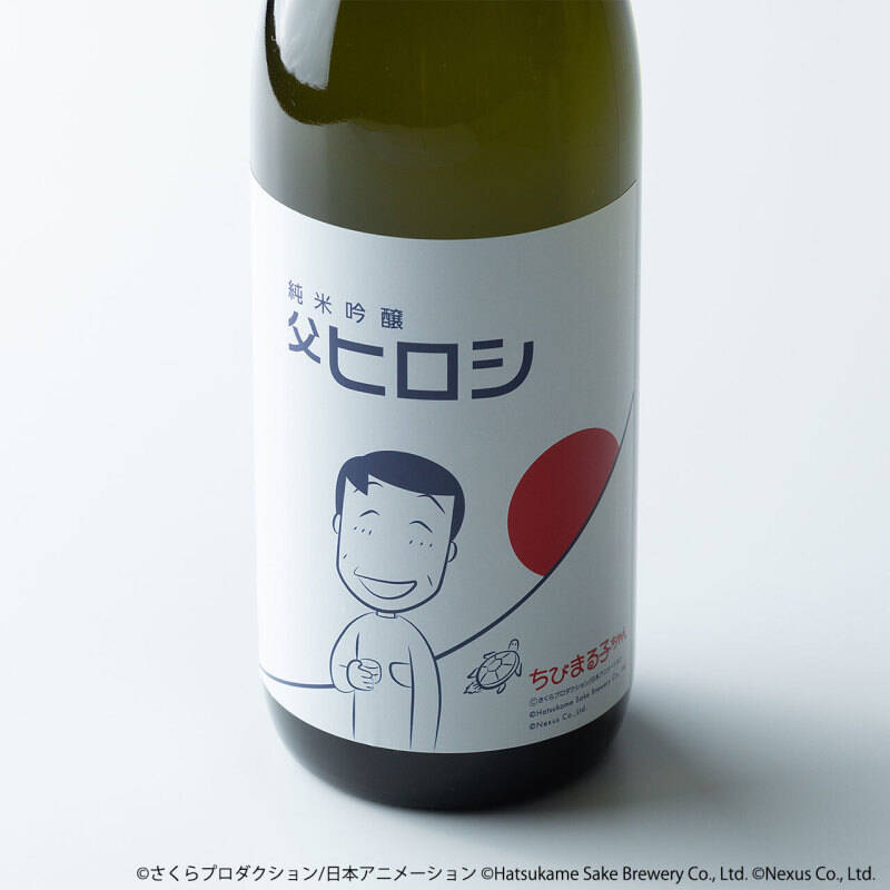 使用了小丸子故事舞台的静冈水、米、酵母精心制作而成。外包装与酒标设计的图样为喝醉后露出茫茫微笑的老爸,手中拿着清酒杯的居家造型~背景设计则是代表静冈县的富士山日出,另外一旁还有作者樱桃子绘制的小乌龟,象征着「初龟」,恰好与日出互相呼应,整体风格简约又独具设计感!