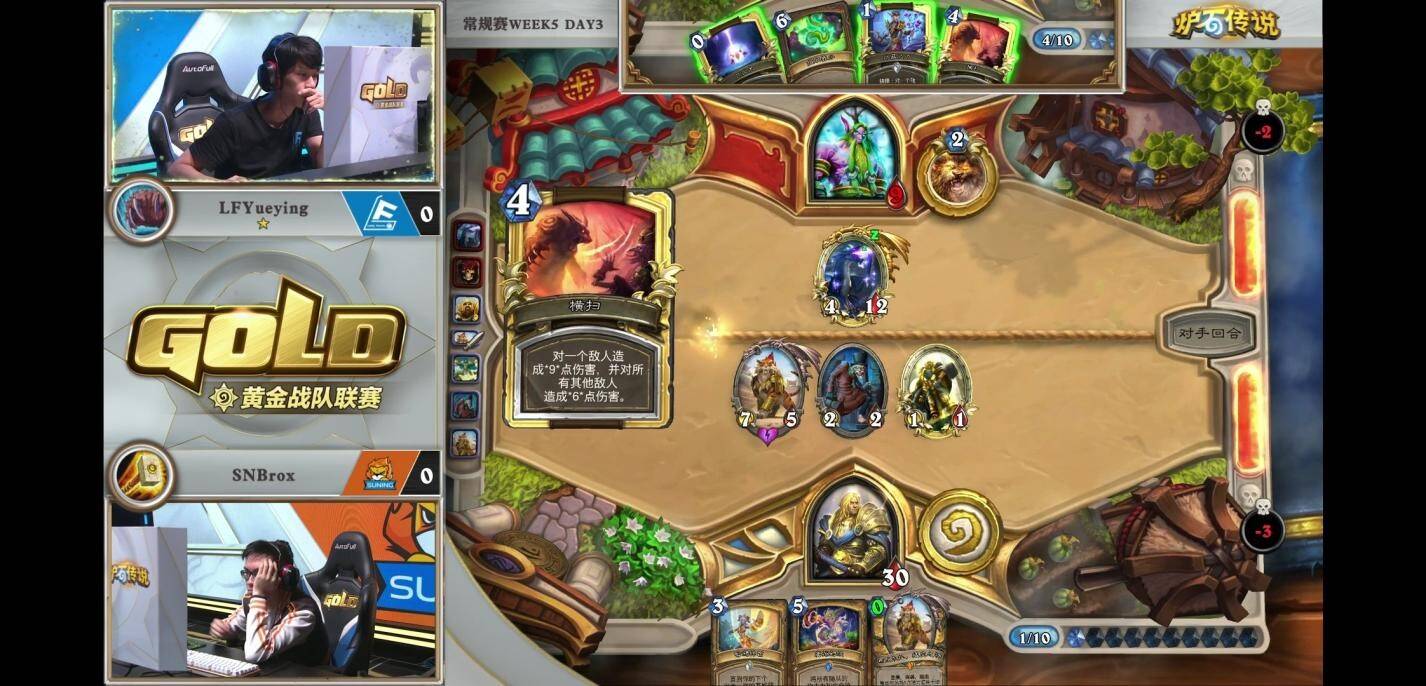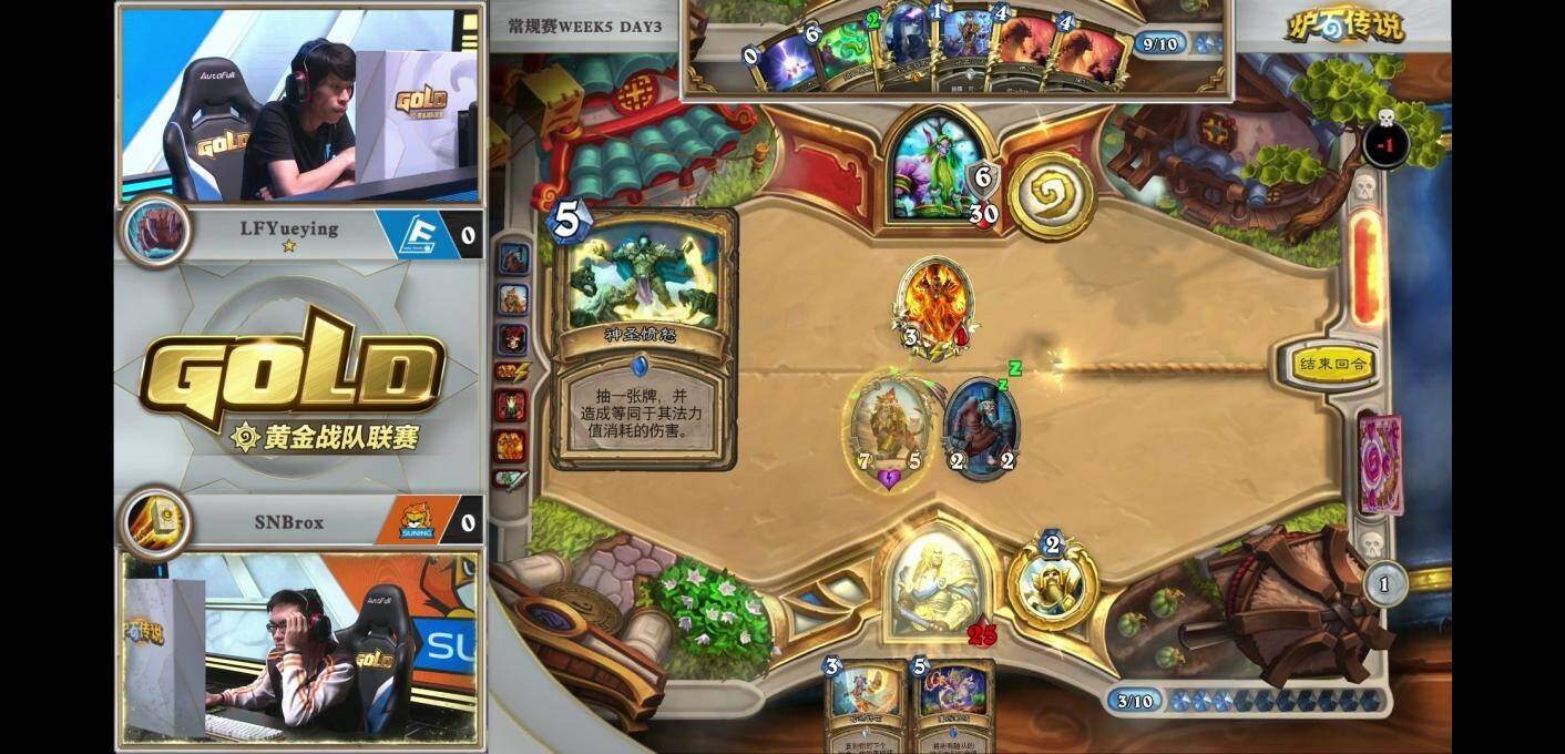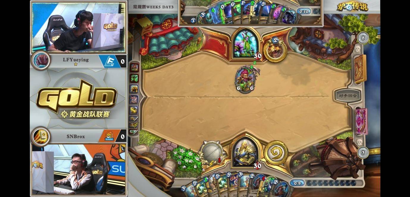 来自LFYueying的蓝龙德对阵SNBrox的元气骑,双方均为需要大量组件的组合技卡组,但过牌速度更快的元气骑目前进度更快。月影打出866乔巴斯过到1 费的大法师瓦格斯和无面,操纵者。虽然作为减费目标而言相当不错,但月影缺乏配合蓝龙的直伤牌,没有斩杀能力。反观元气骑却牌库即将抽干,即便下回合能凑齐组件,元气骑也能连续开出无敌,难逃两发25点的斩杀。