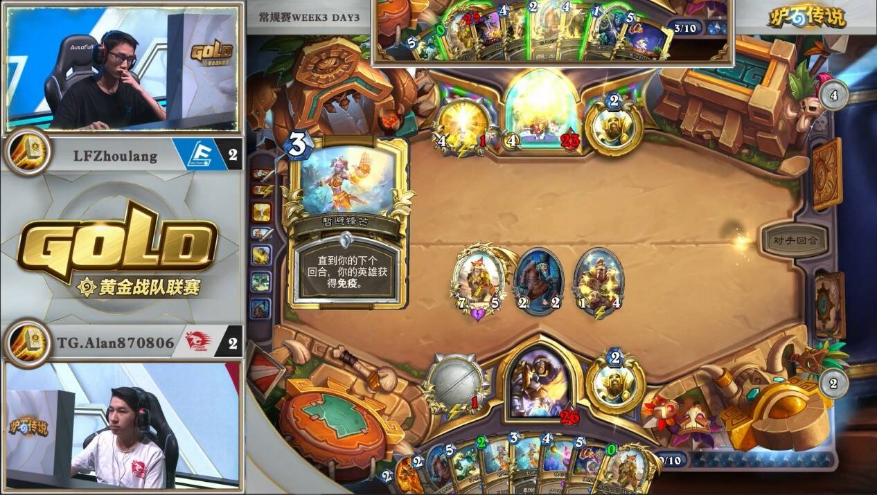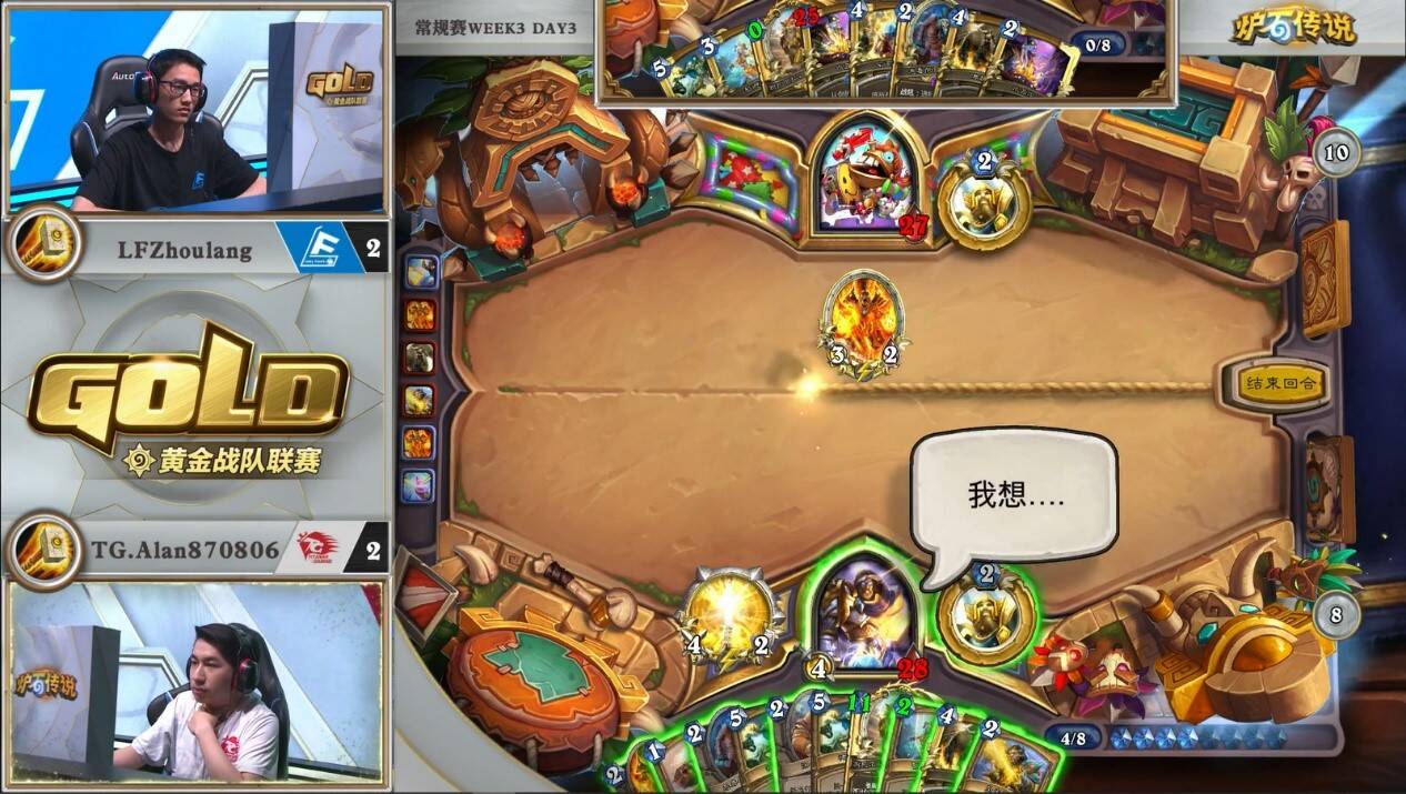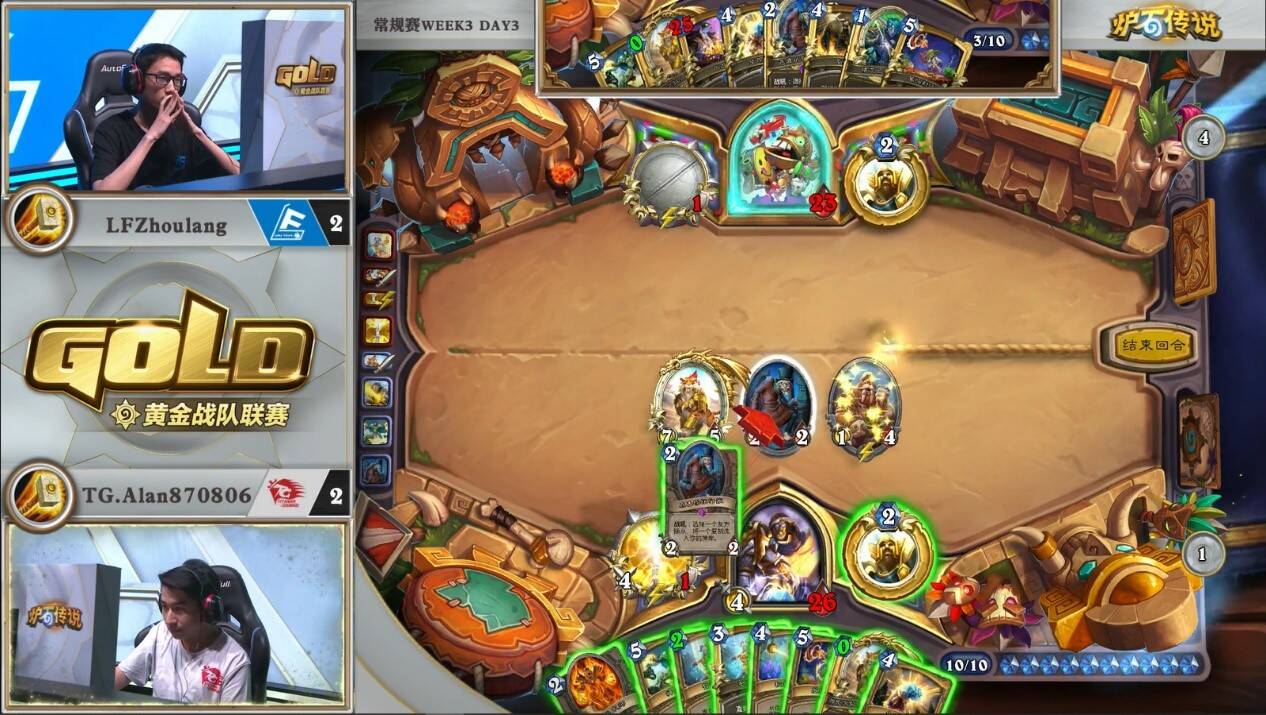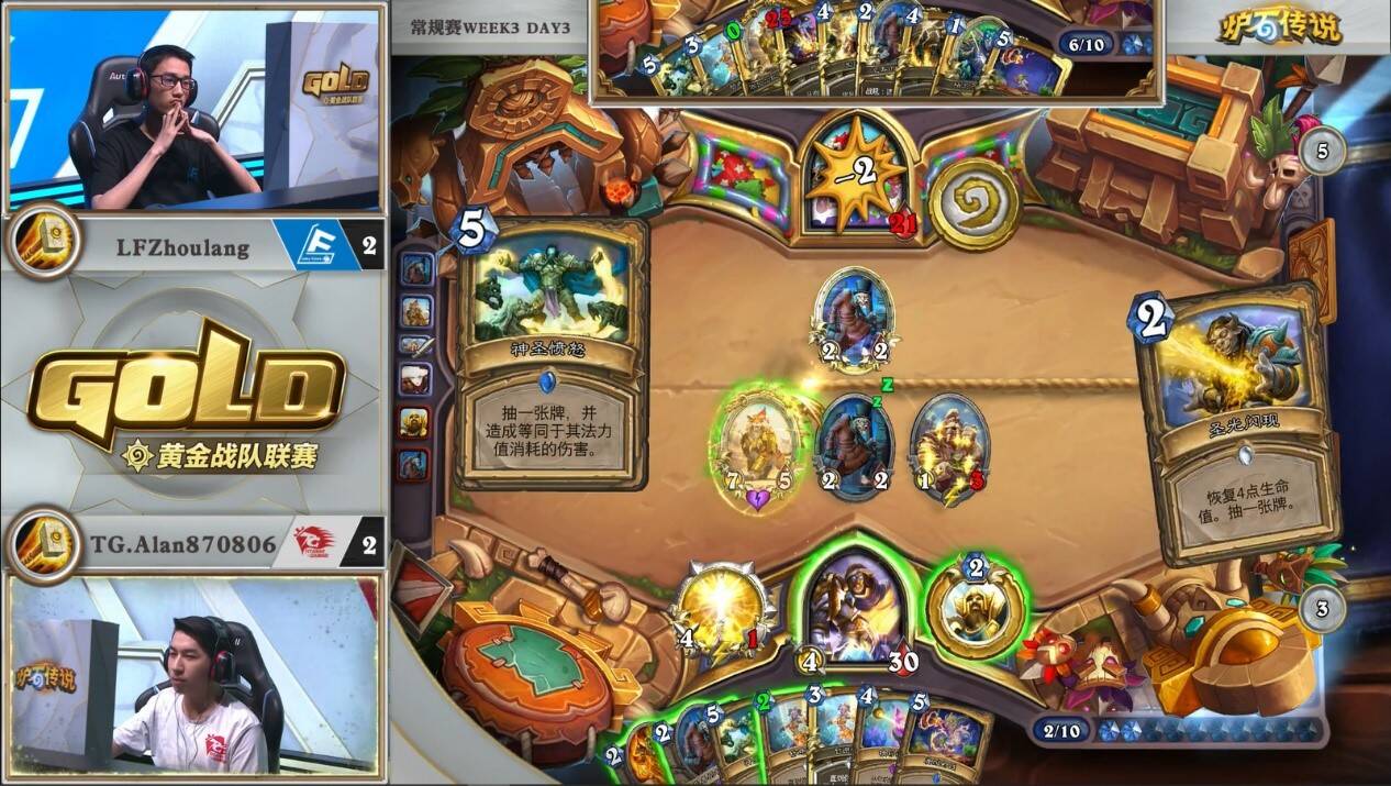 在牌库还剩4张牌时,由Alan率先发难,打出第一发神圣愤怒小赌一手1/4的概率,可惜失败。这样虽然压缩了自己的牌库,给下回合斩杀提供了更大可能,但也意味着他放弃了单回合两发元气弹+刀的斩杀。
