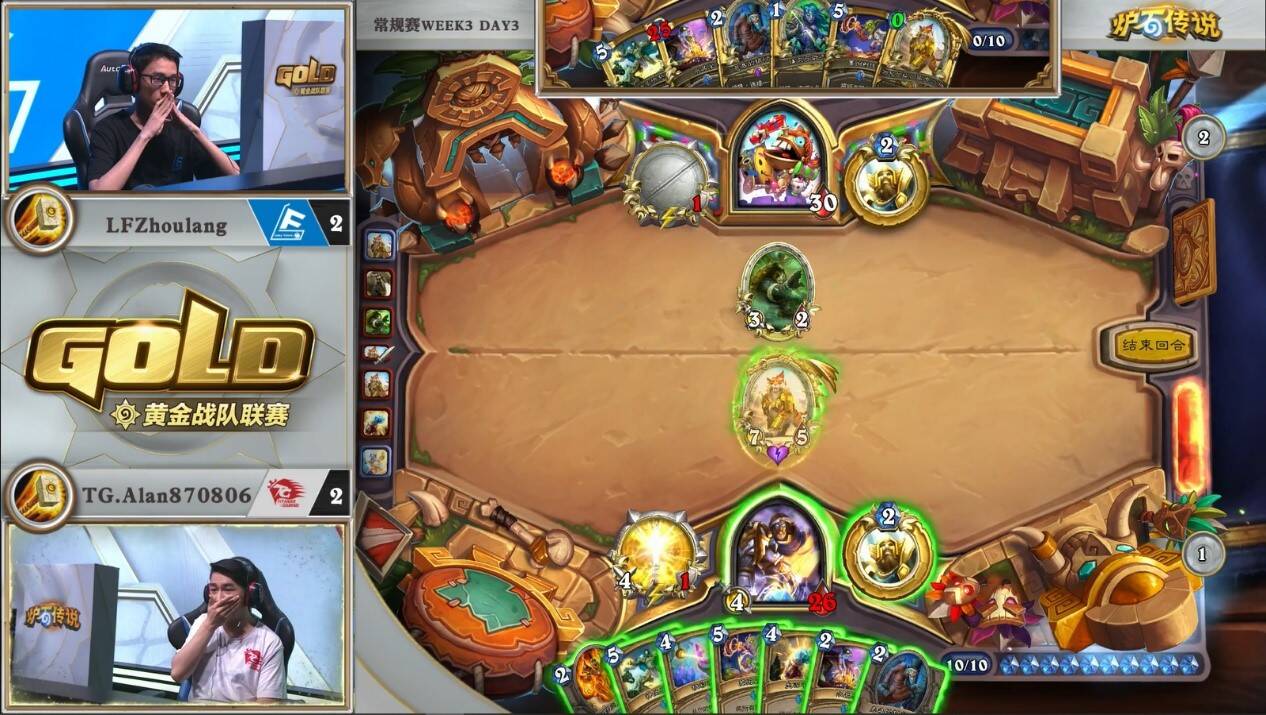 此时Alan方才后知后觉,由于前面交掉了两个精灵弓箭手,他只能在单回合内打出29点斩杀,因此现在他已经处于绝对的劣势之下。Alan也只能无奈摇头后选择把周郎血量压制到1,场面拉满的打法,希望能靠场面压死对手。