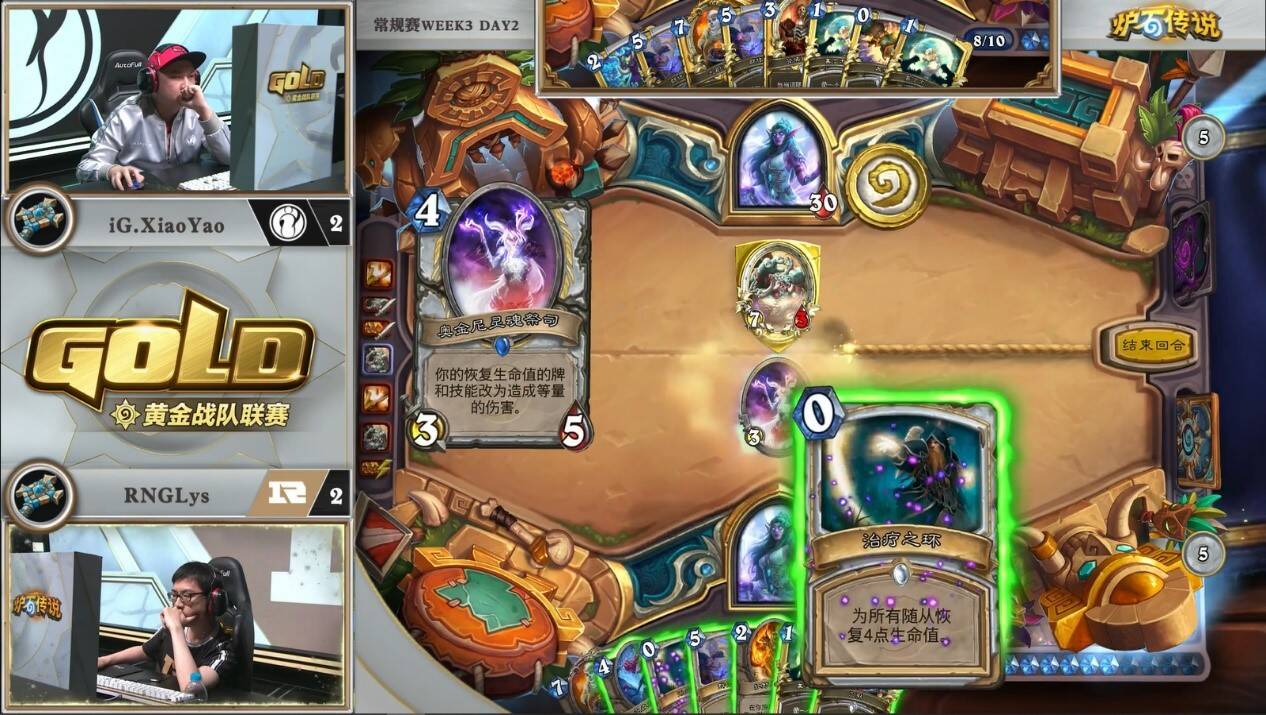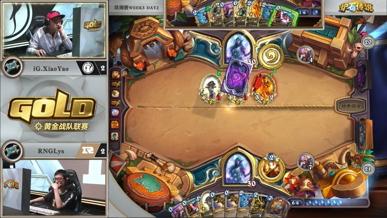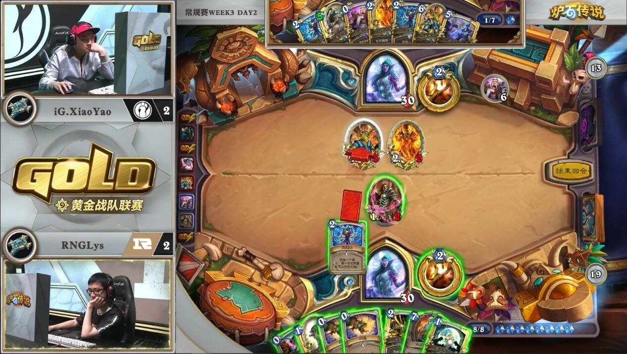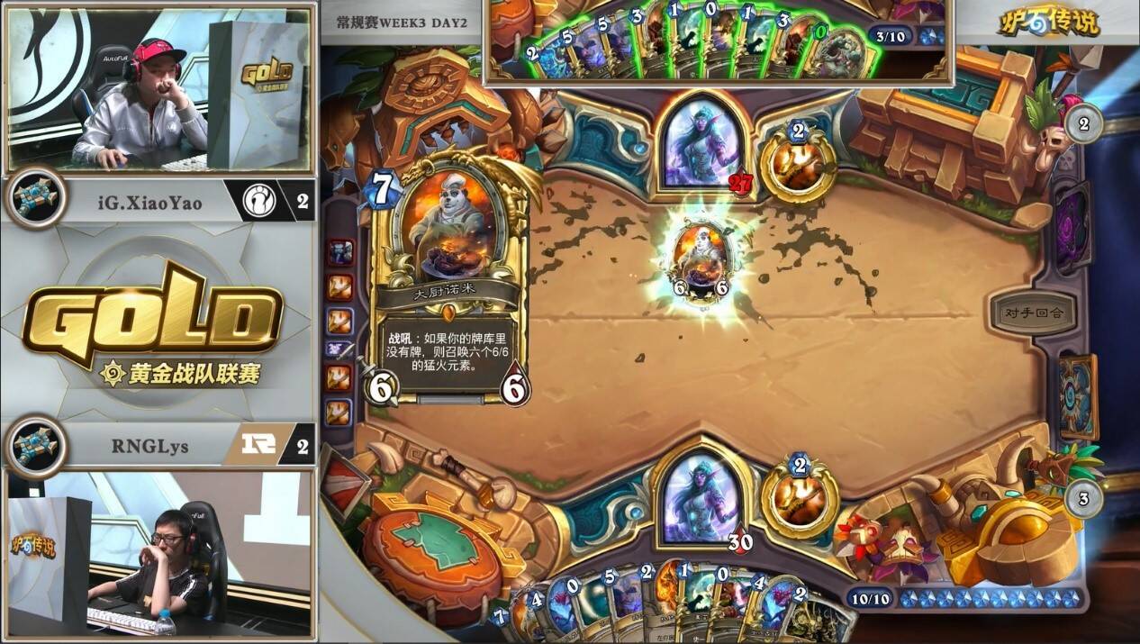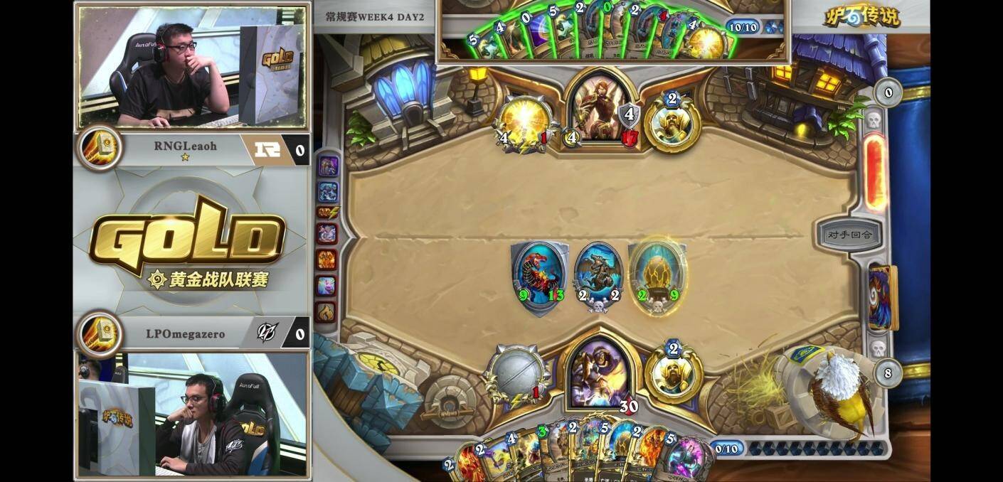 来自LPOmegazero的机械骑对阵RNGLeaoh的元气骑。对局中一方游戏计划展开缓慢,而另一方需要过穿牌库来打出组合技。本次比赛中,LP并没有携带比赛中表现优异的元气骑,而是选择了笨重的机械骑。而看似作为一套有着能给控制卡组带来源源不断压力的中速套牌,即便在6-7费的中期,场攻不过两点。虽然亡语里有着8/8和7/7的衍生物,但元气骑完全可以选择无视。看似人畜无害,但小7已经在慢慢筹划他的游戏计划。