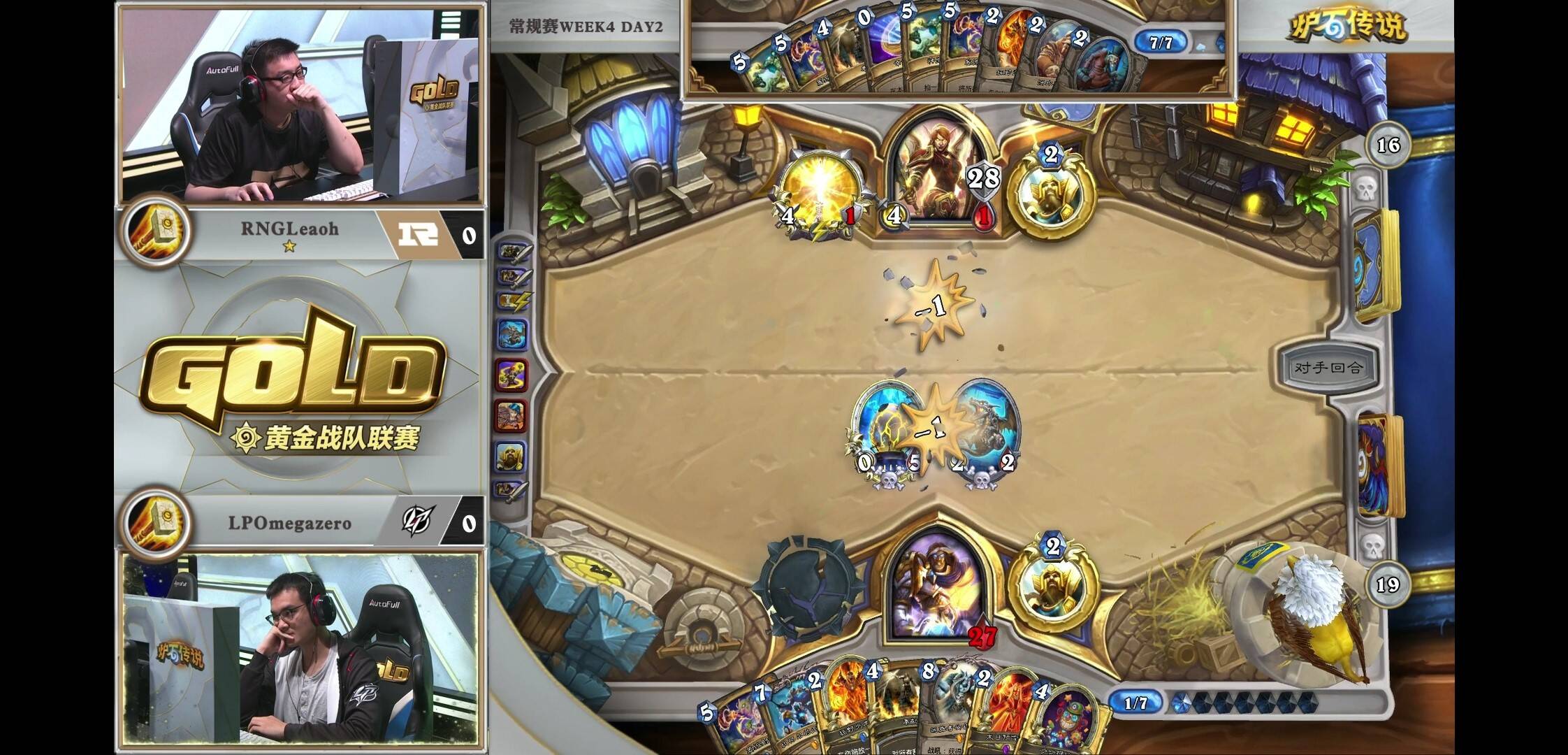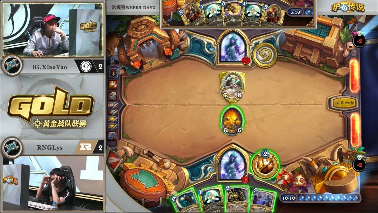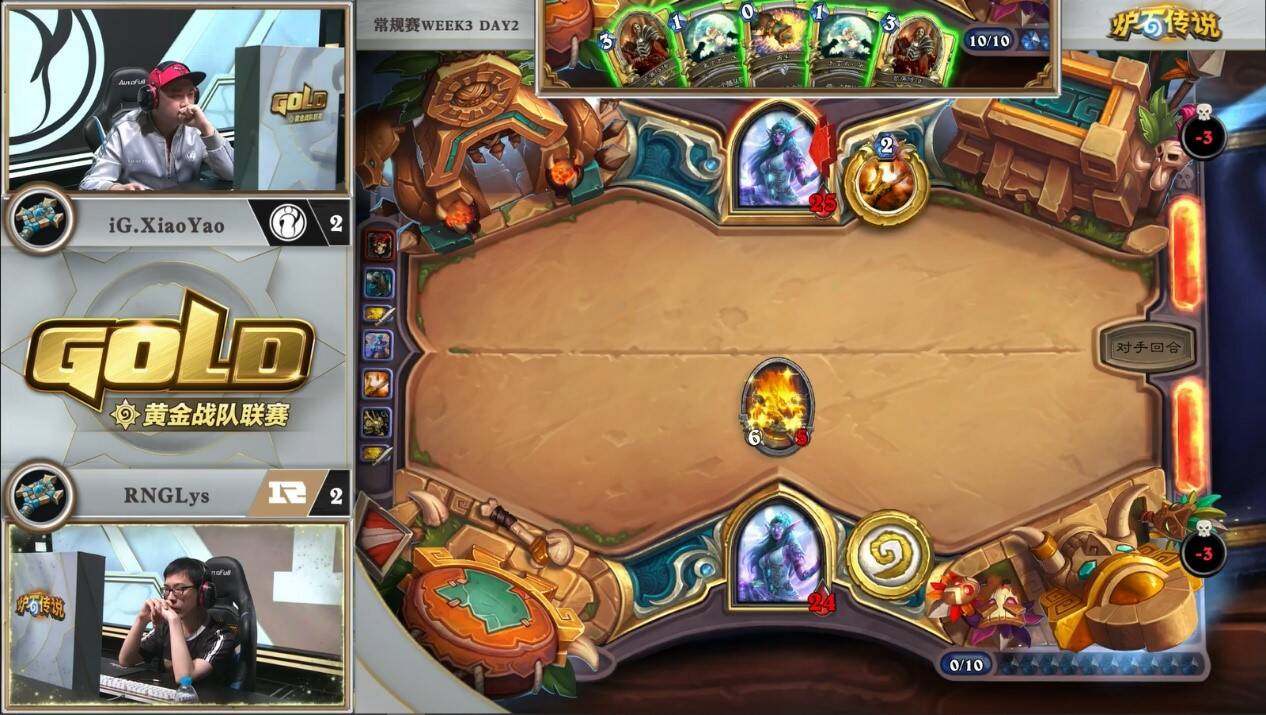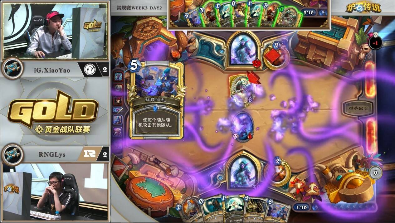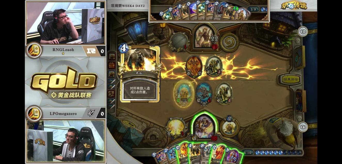 来自LPOmegazero的机械骑对阵RNGLeaoh的元气骑。对局中一方游戏计划展开缓慢,而另一方需要过穿牌库来打出组合技。本次比赛中,LP并没有携带比赛中表现优异的元气骑,而是选择了笨重的机械骑。而看似作为一套有着能给控制卡组带来源源不断压力的中速套牌,即便在6-7费的中期,场攻不过两点。虽然亡语里有着8/8和7/7的衍生物,但元气骑完全可以选择无视。看似人畜无害,但小7已经在慢慢筹划他的游戏计划。