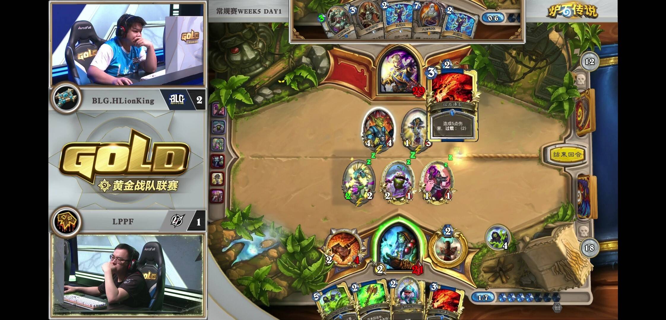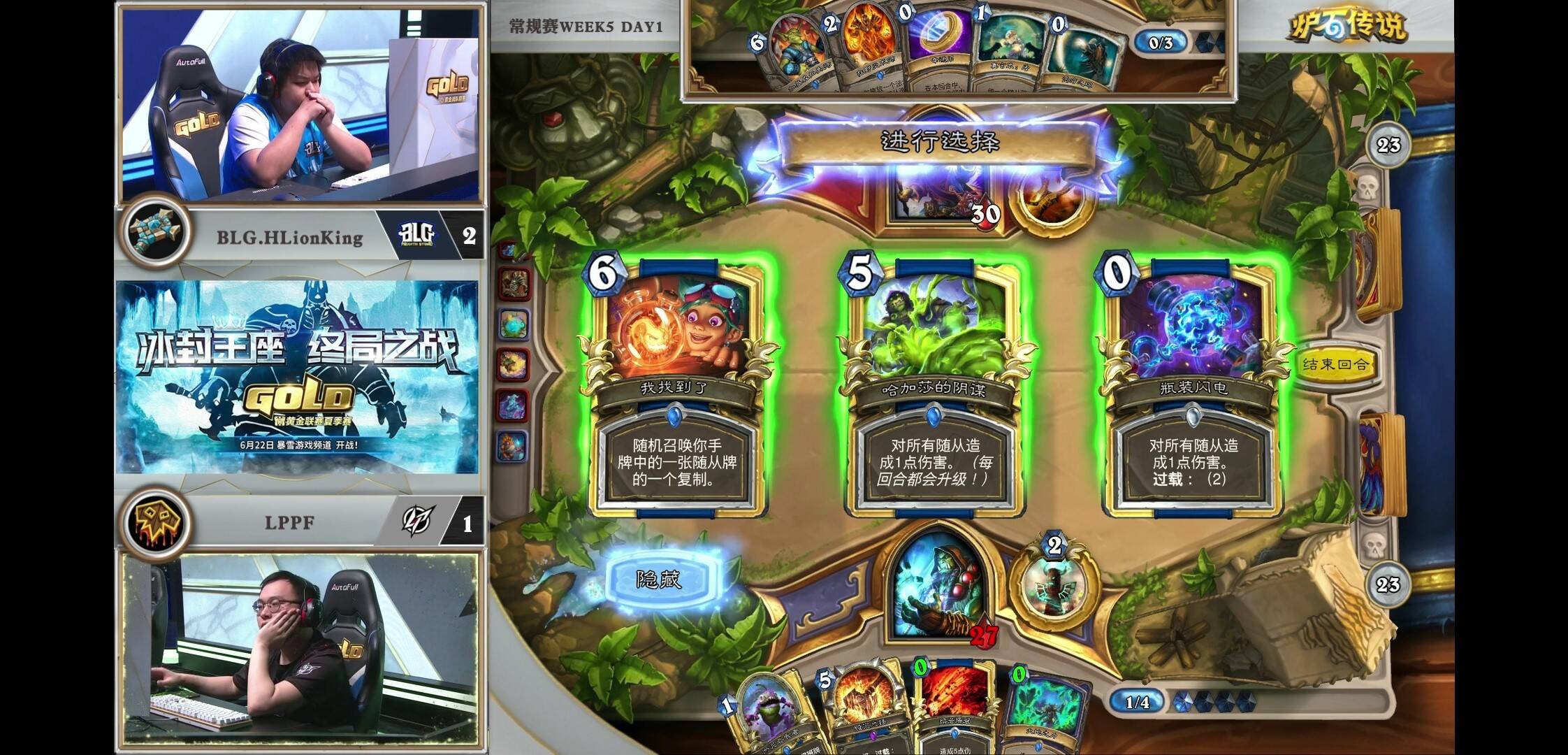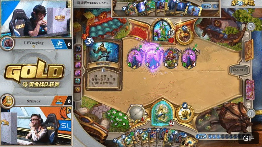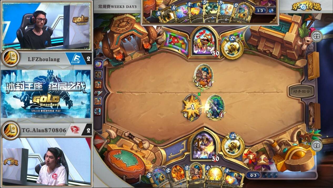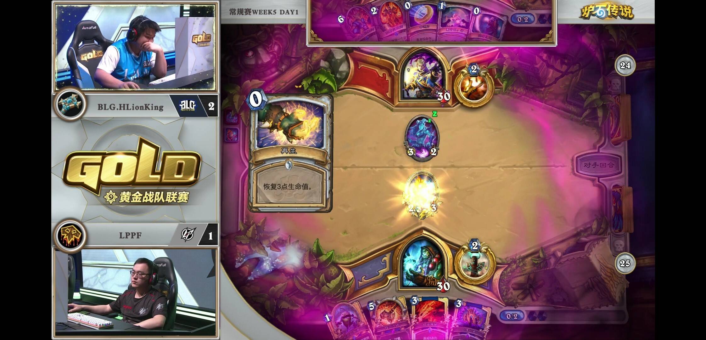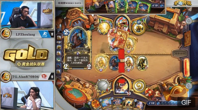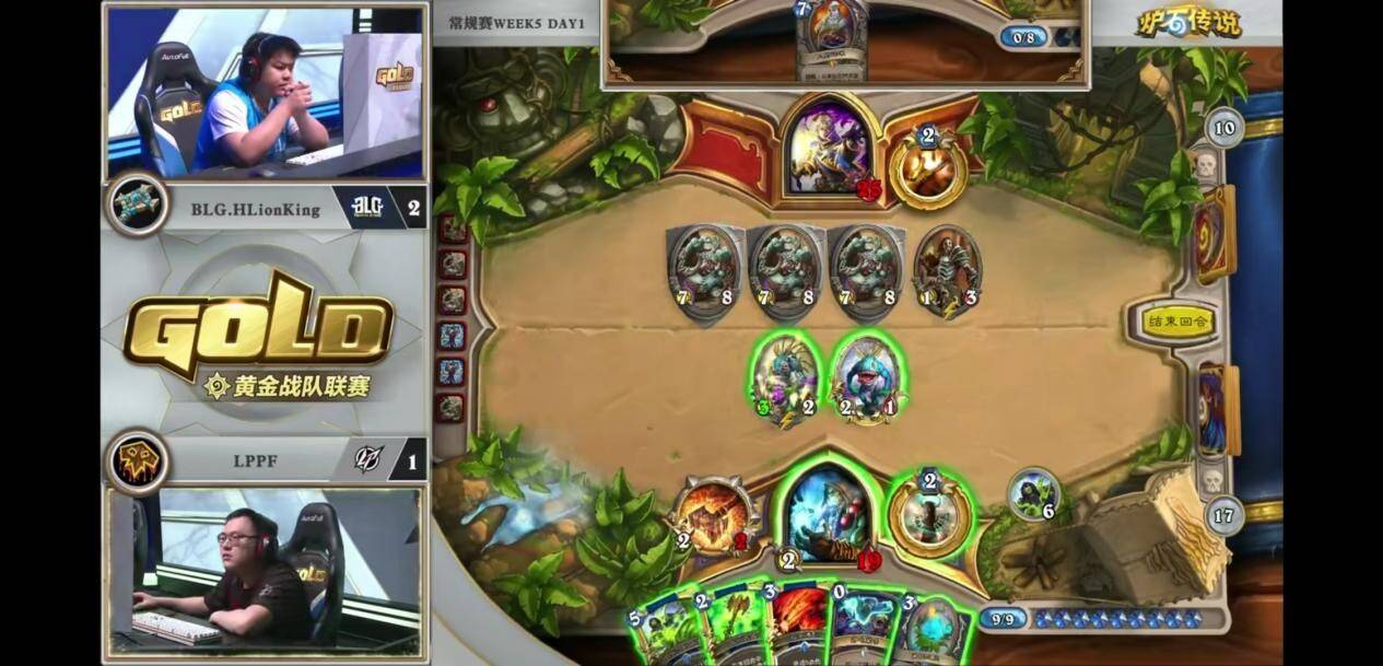 来自BLG.HLionKing的大厨牧对阵LPPF的打脸萨。2:1的窘境之下,胖枫选择了同时具备上限和counter牧师能力的鱼人打脸萨。开局胖枫出师不利,2费顺出的资源引擎下水道鱼人被奥金尼幻象配合再生处理了。反观大厨牧炎术士加基森具在。局面相当落后。