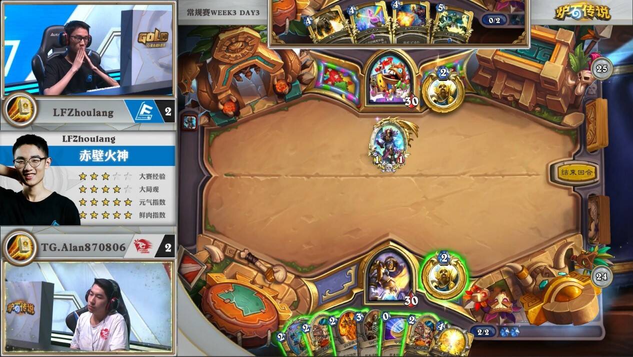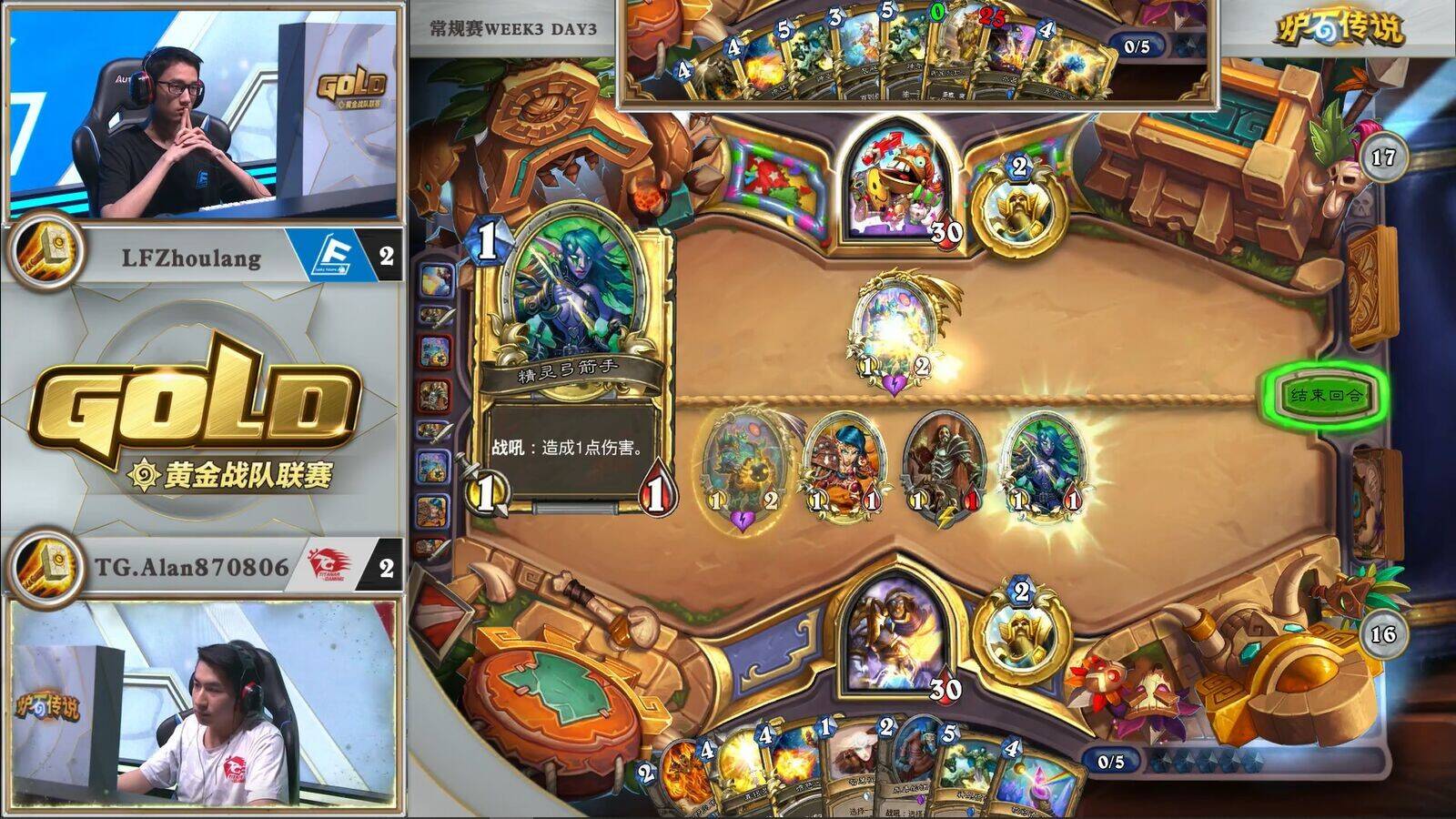 Alan也很清楚内战很容易爆牌,于是他为了卸手牌分别在3费和5费回合把精灵弓箭手当节奏牌打了,在当时看这样是没问题的,但却埋下了一点伏笔,我们暂且按下不表。