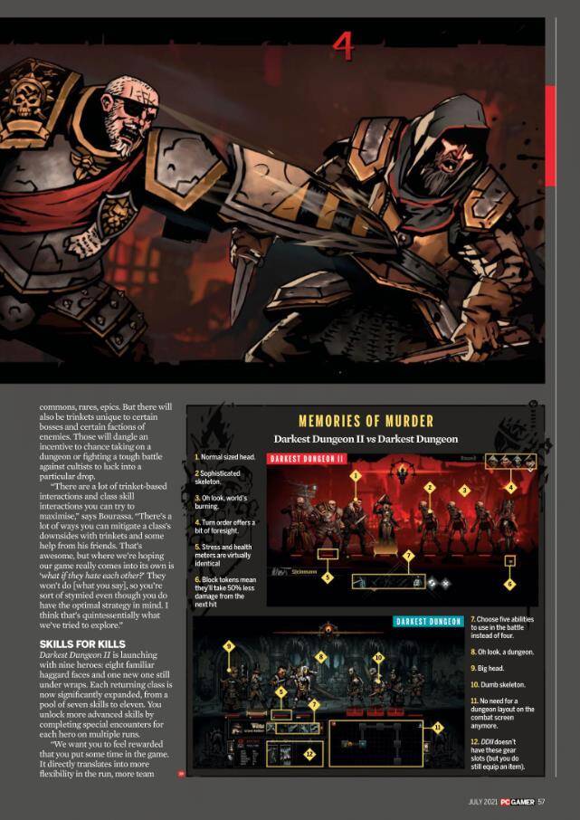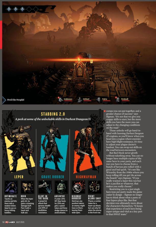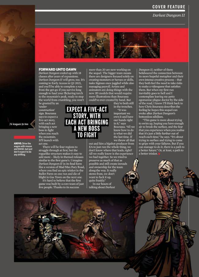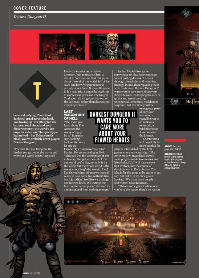 PC Gamer上周公布了7月的杂志期刊,部分内容最近在网上曝光,其中就提到《暗黑地牢2》会在今年开启“抢先体验”测试,时间在第三季度左右(Q3 2021);测试版可玩5小时左右,后续会再推出4个章节。此外游戏开发者还对本作的很多玩法机制进行了大幅改动。