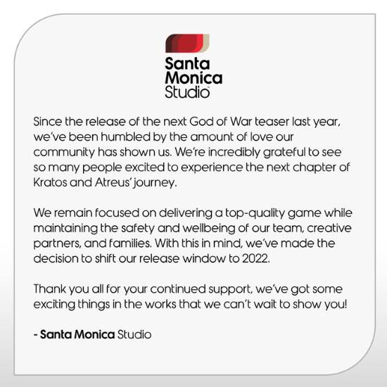 圣莫妮卡工作室官推发文宣布:《战神》新作受疫情影响延期至2022年发售。另外在PlayStation 工作室负责人Hermen Hulst的PlayStation博客采访中,他也讲到了《战神》新作延期的事情,同时确定了本作将跨世代,登陆PS4/PS5。同时提到的跨世代游戏还有《GT7》。