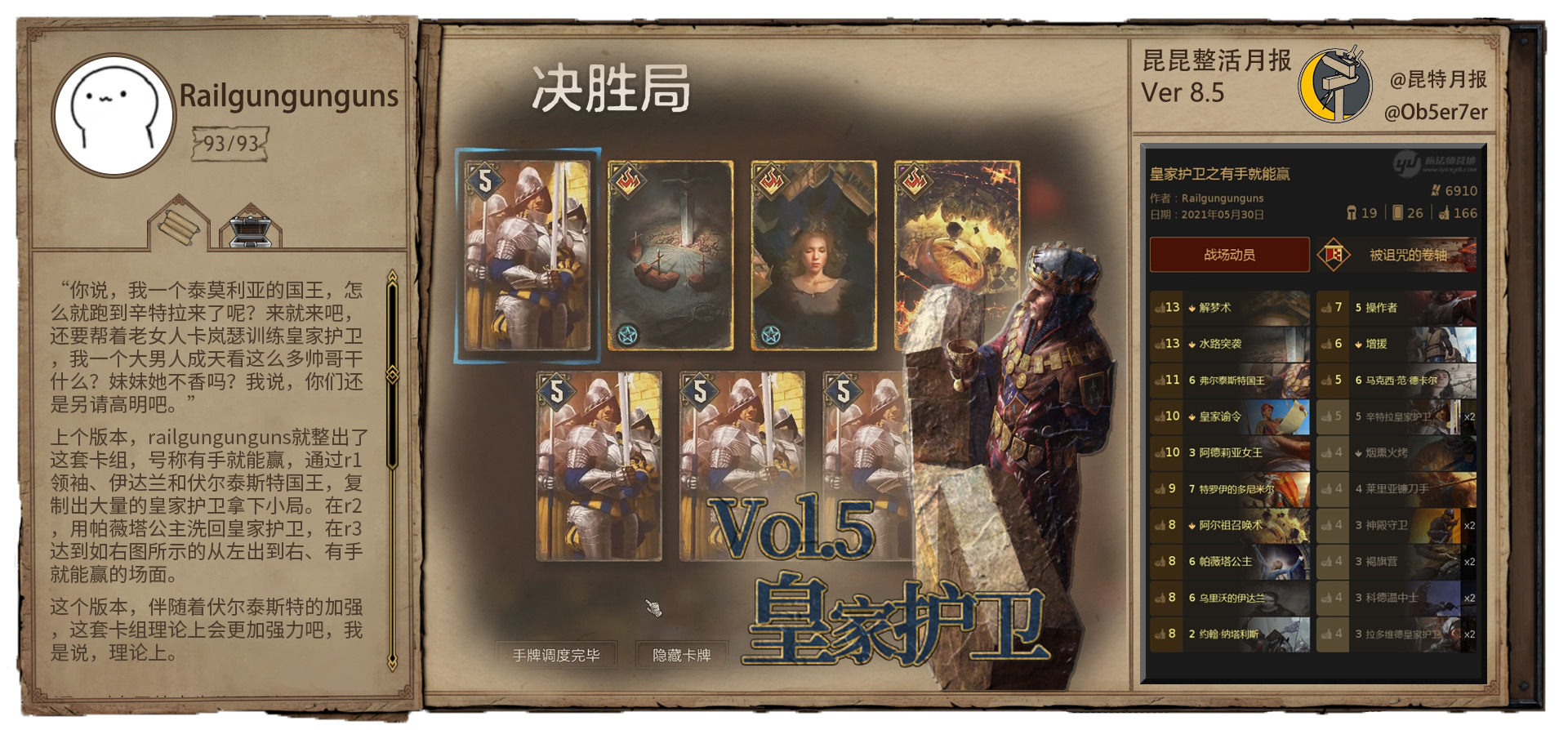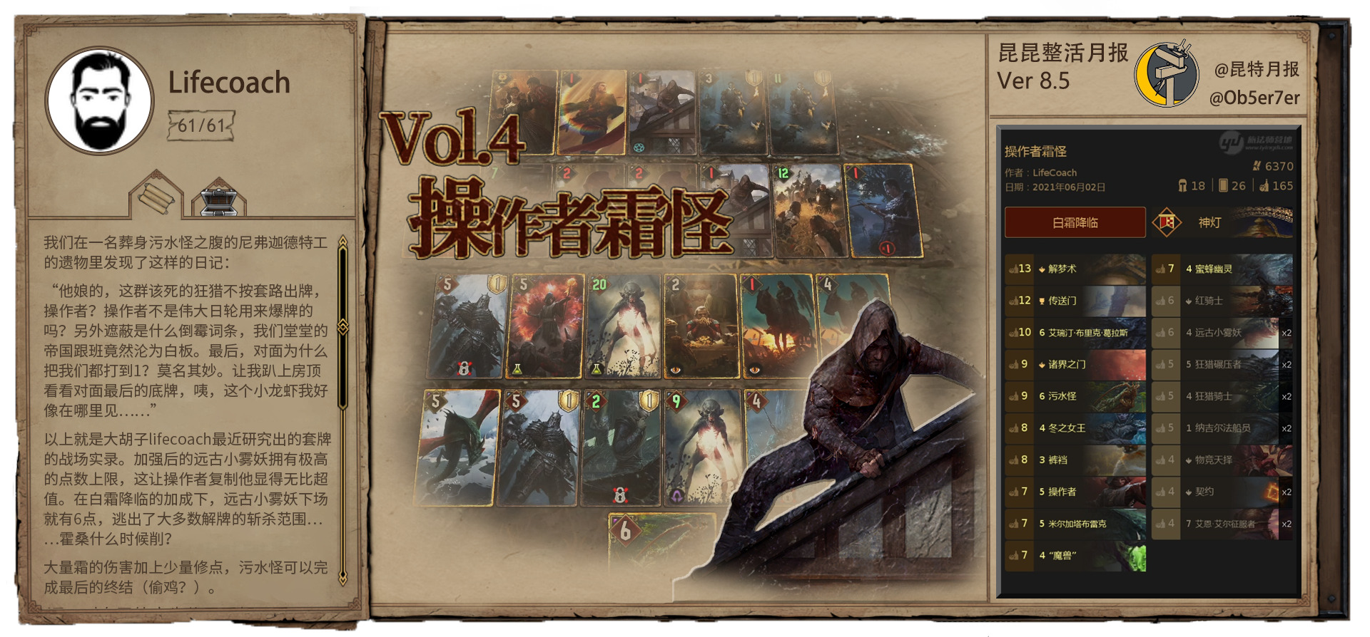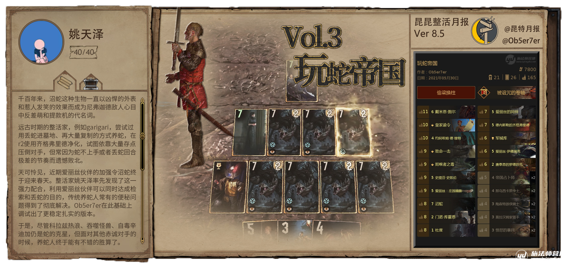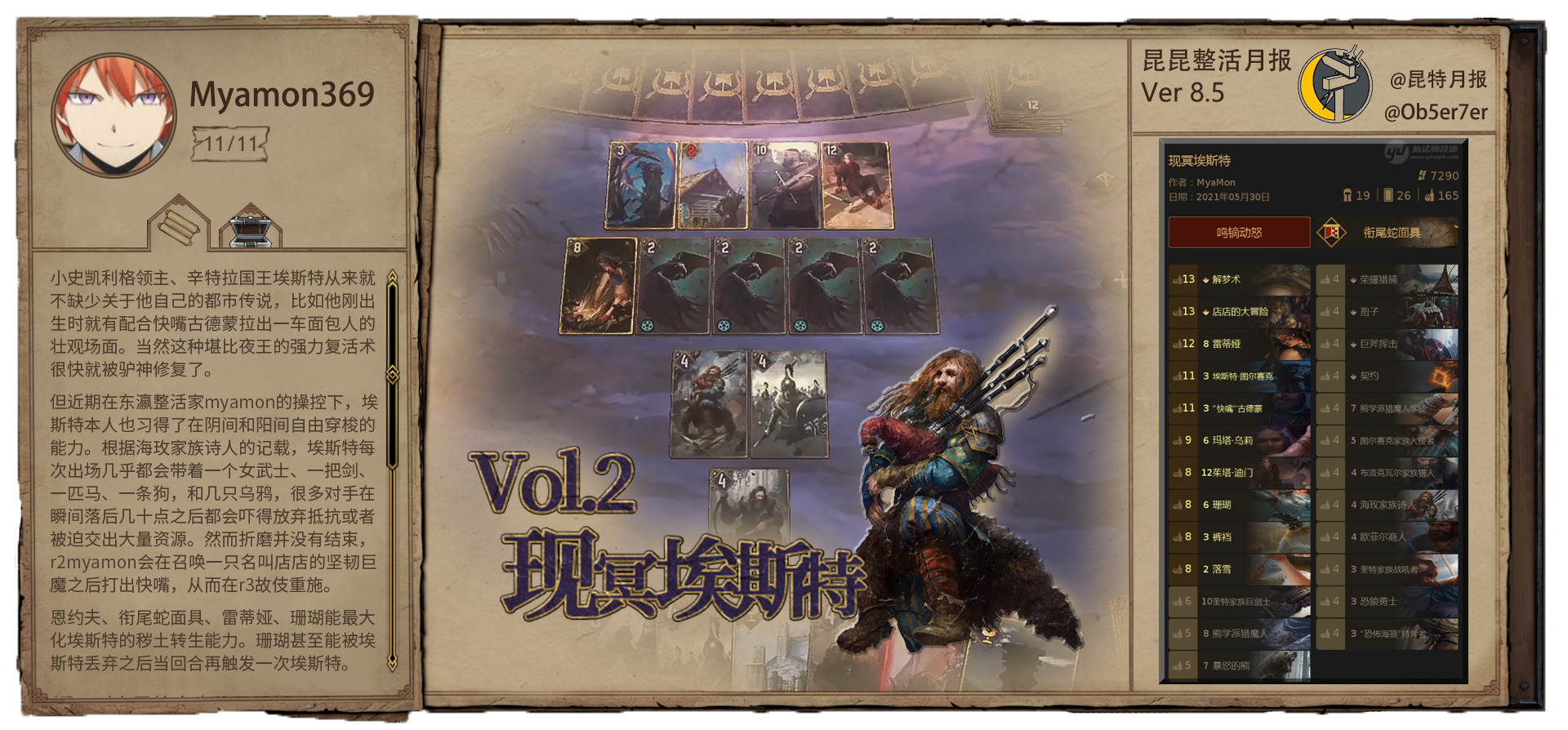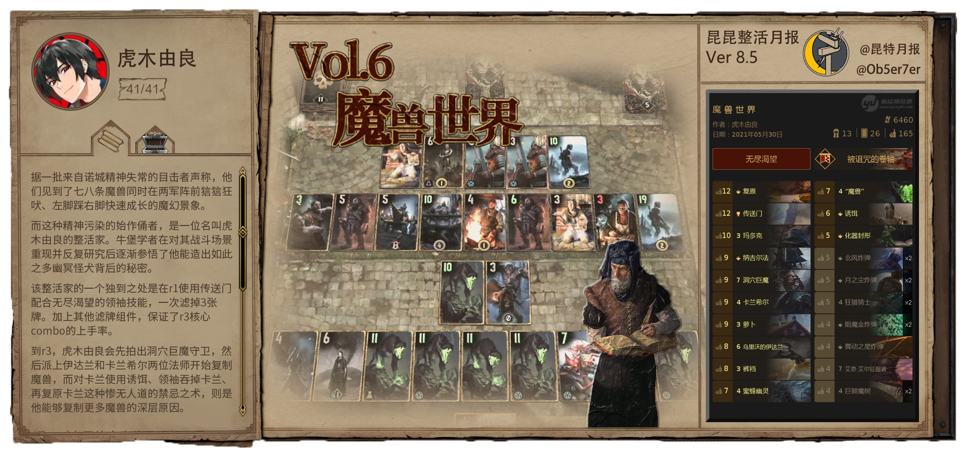 所以,这段时间不妨来找点乐子!在“整活月报”中,0b5er7er将精选每个版本最为有趣好玩的卡组,制成精美的图片,并辅以视频解说,力图为大家带来焕然一新的阅读体验。