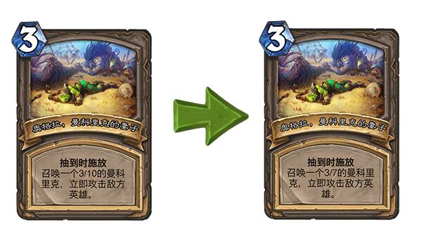 开发者评论:我们会降低怒火攻心的曼科里克的生命值,以限制在对局前期抽到奥格拉的效果。7点生命值比较容易被第4至第6回合可用的中期解场手段处理掉。