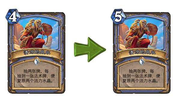 开发者评论:法术法目前的爆发回合过多,而清凉的泉水在其中发挥了关键作用。我们将清凉的泉水削弱到5点法力值消耗,希望能降低清凉的泉水抽取卡牌并返还法力值的极端回合出现的频率。通过降低这些操作的频率,套牌的随机性应该会与其他现有的选项保持一致。
