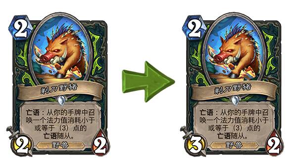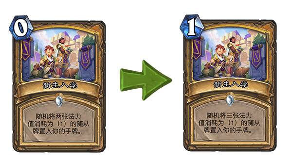 开发者评论:我们正在关注圣骑士多个主流套路长久以来的强势表现,并会通过削弱新生入学来限制圣骑士在对局前期的强度。提升新生入学的法力值消耗和产生的随从数量后,这张卡牌现在的作用是产生价值,而不是最初的润滑曲线。