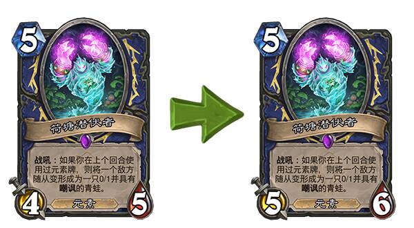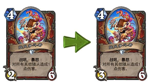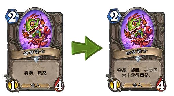 开发者评论:螃蟹骑士在部分场面类套牌中表现过于突出,能够在清理掉随从后靠风怒飚出大量伤害。我们将螃蟹骑士的风怒改为持续至回合结束,降低了它在多个回合里的致命程度。我们希望螃蟹骑士依然是夺回场面的理想之选,尤其是和增益效果搭配的时候。